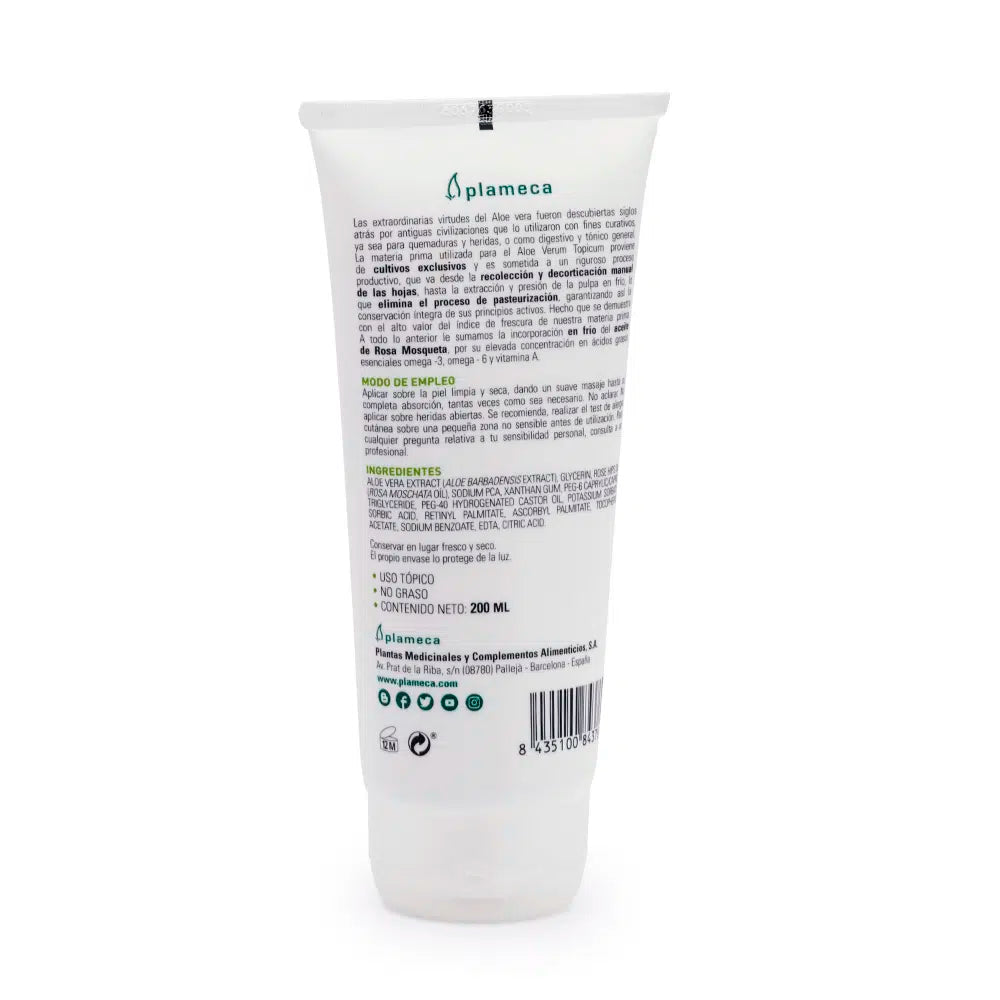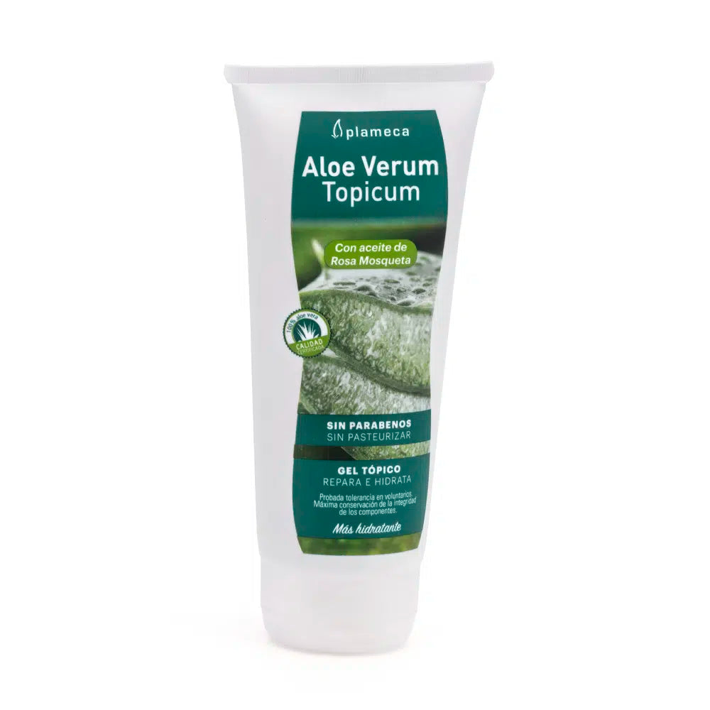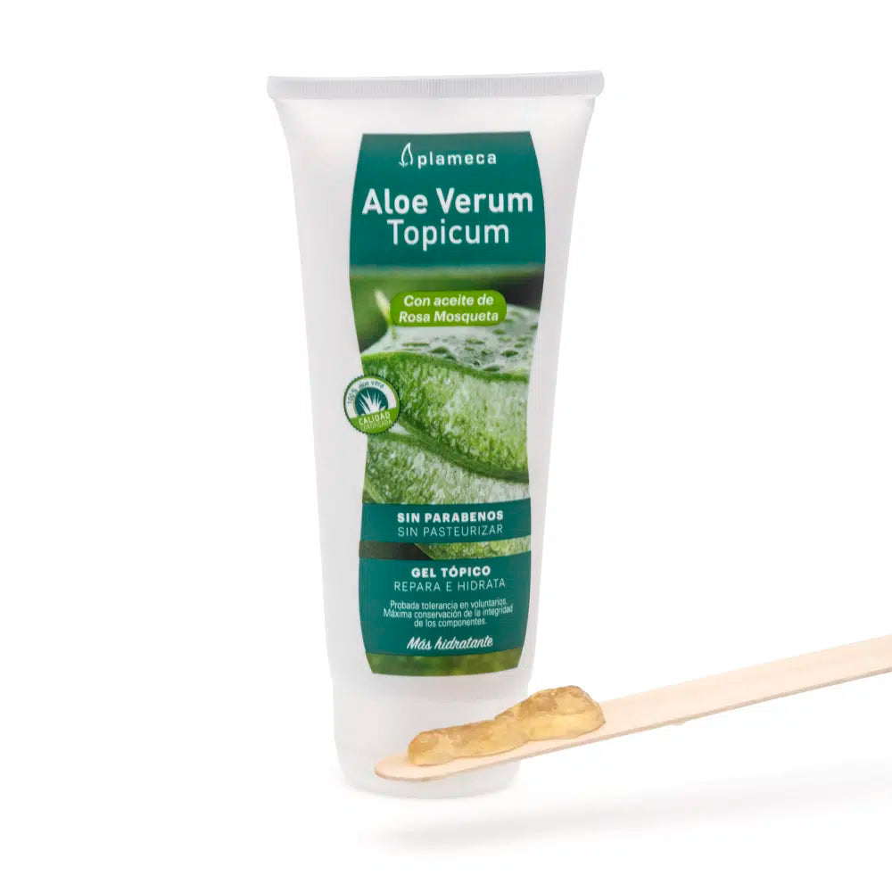 Aloe Verum Topicum es el gel 100% de jugo de aloe procedente de cultivos exclusivos de aloe vera andaluces, con rosa mosqueta y sin parabenos.