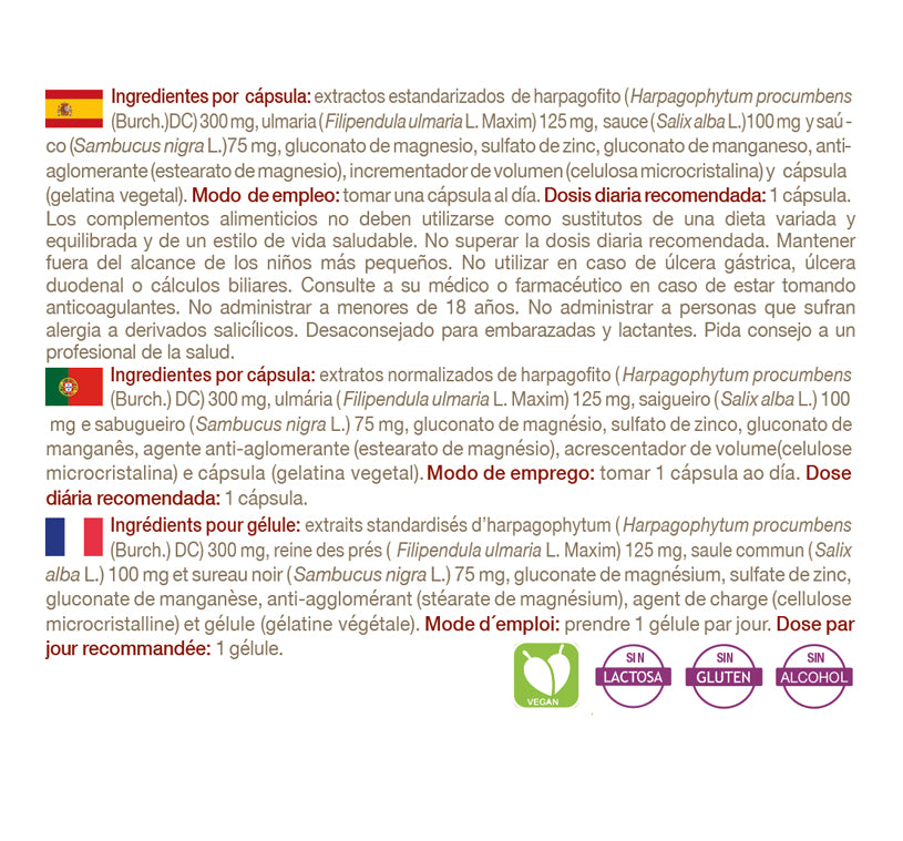 - Efecto antiinflamatorio y analgésico, producido por los Harpagósidos debido a la inhibición de la enzima ciclooxigenasa-2 y a la inhibición de citoquinas proinflamatorias que inician la cascada inflamatoria.