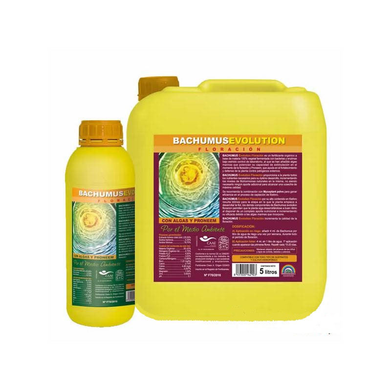 Bachumus Evolution® Floración es un fertilizante 100% orgánico compuesto únicamente por materia vegetal que ha sido descompuesta y fermentada en los laboratorios con bacterias y enzimas. A esta materia vegetal se le añaden algas marinas, cuyas propiedades son ideales para estimular una buena floración en las plantas.
