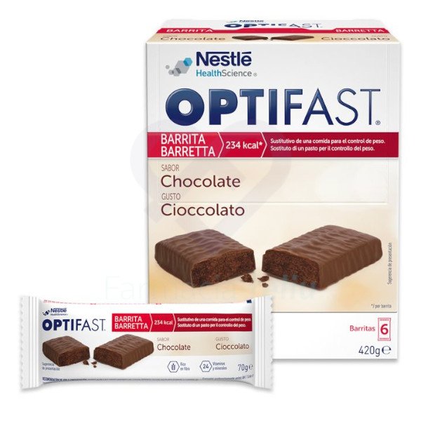 Facilita la pérdida y control de peso a personas con sobrepeso u obesidad en dietas hipocalóricas con las Barritas Optifast Chocolate; un sustitutivo de comida de laboratorios Nestle para perder peso de forma saludable y controlada.
