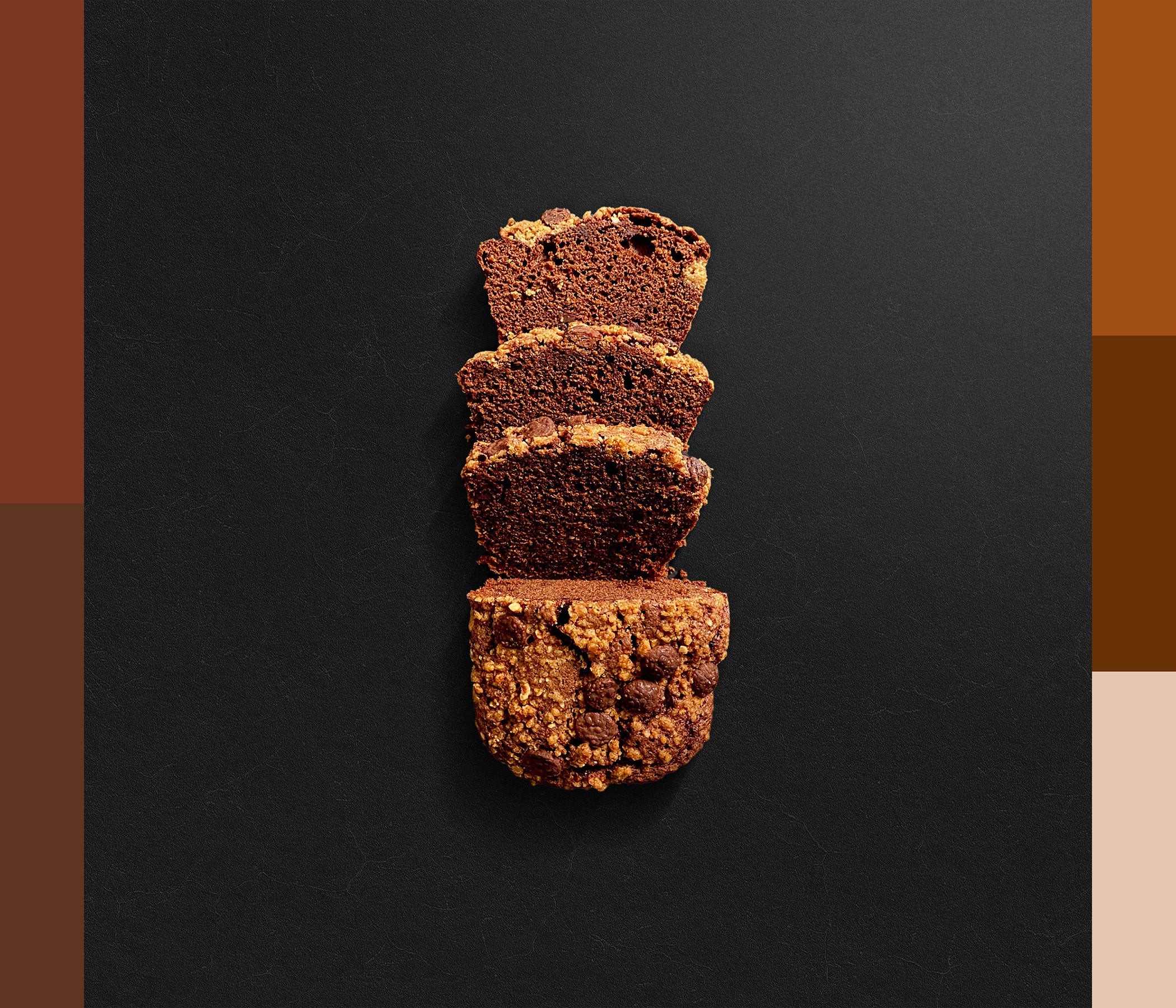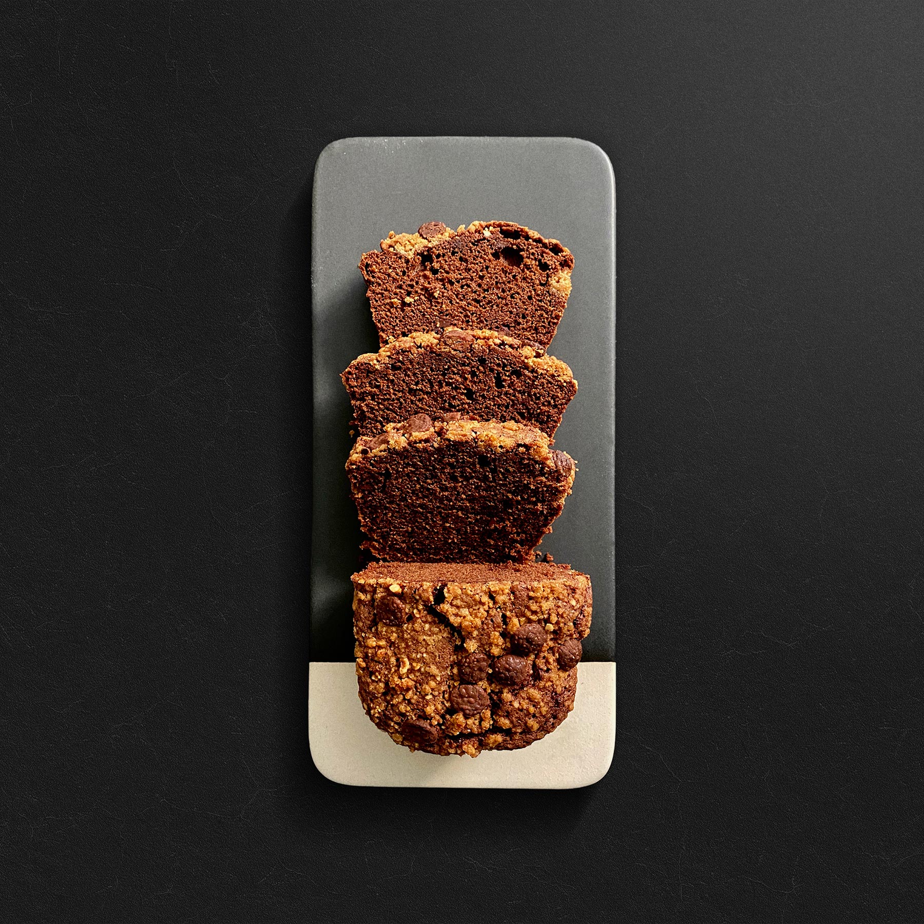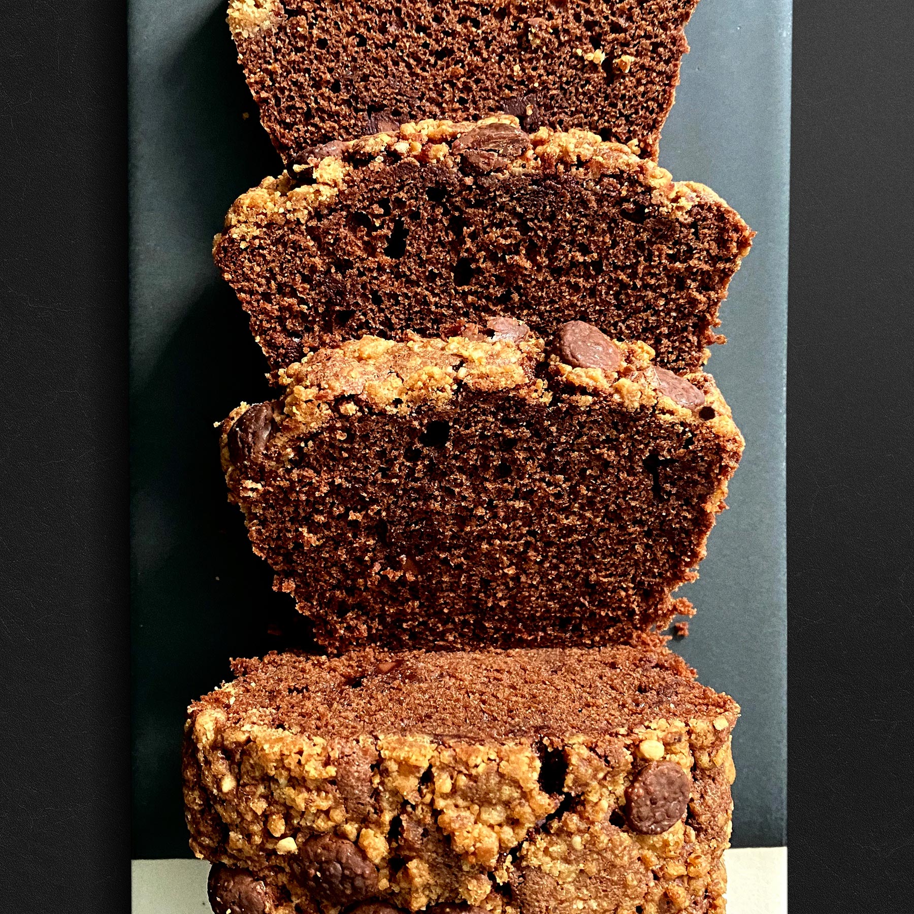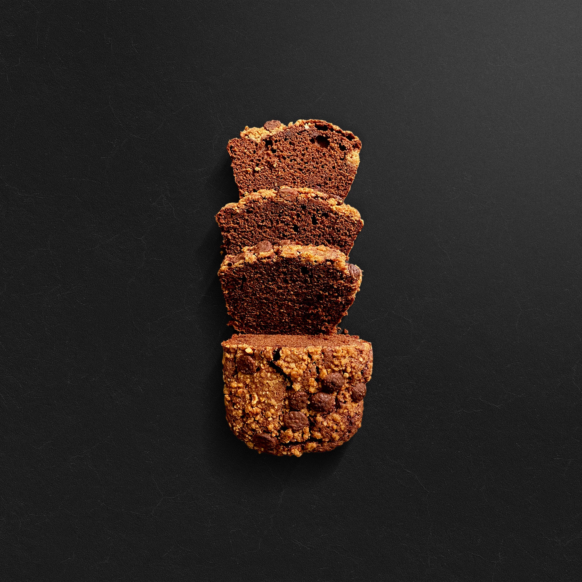 Bizcocho de chocolate jugoso y tierno con chips de chocolate en su interior y praliné (cacao, avellanas y leche) Gianduja de Cacao Barry.