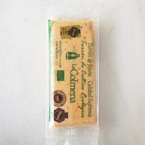 El turrón de pistacho es un turrón con una textura crujiente y un sabor dulce y ligeramente salado. Se elabora a partir de una mezcla de almendra tostada y pistachos, que se mezclan con azúcar y jarabe de glucosa para formar una masa. La masa se extiende en un molde rectangular y se deja enfriar hasta que adquiere la textura final. El resultado es un turrón de color marrón claro con trozos de pistacho visible en su interior.