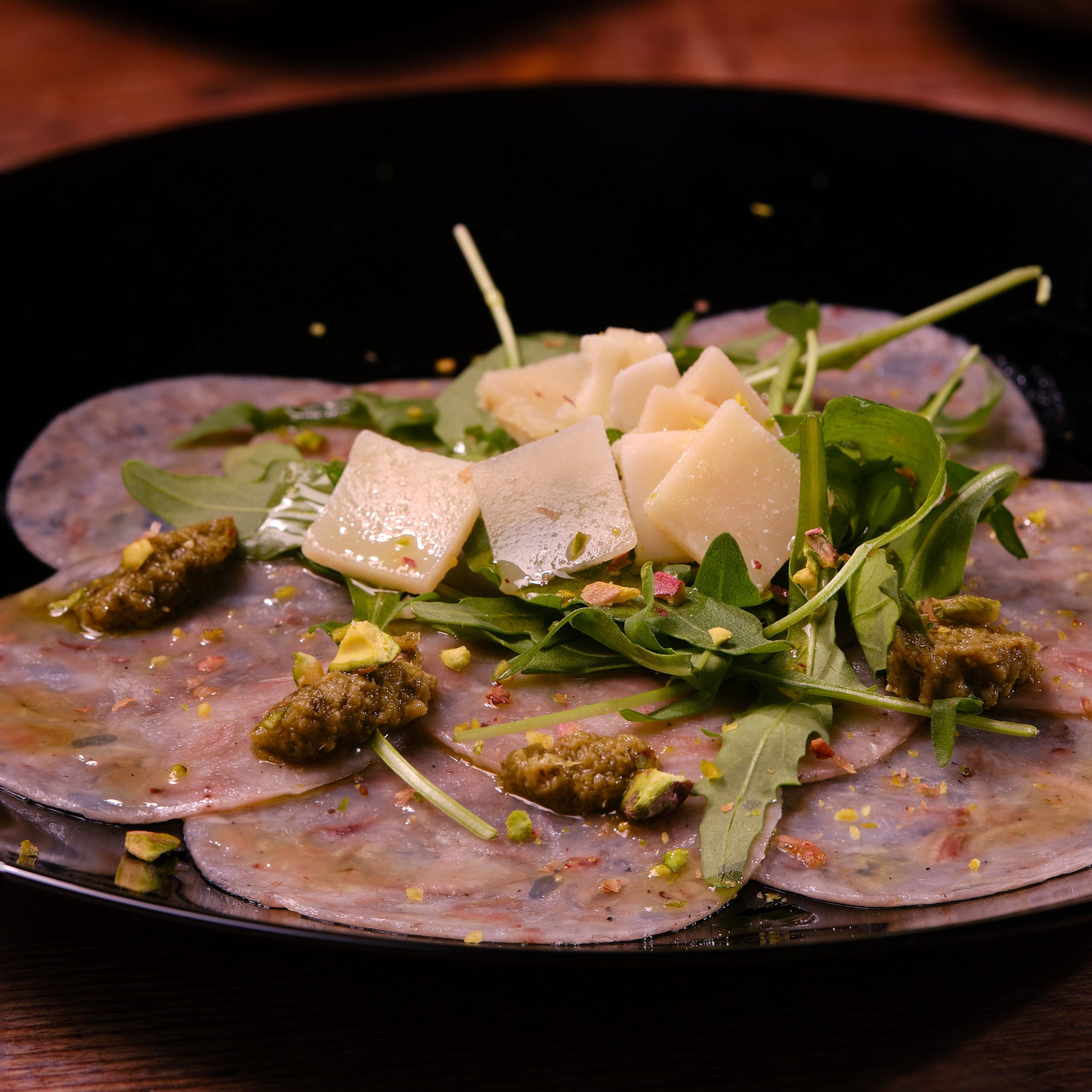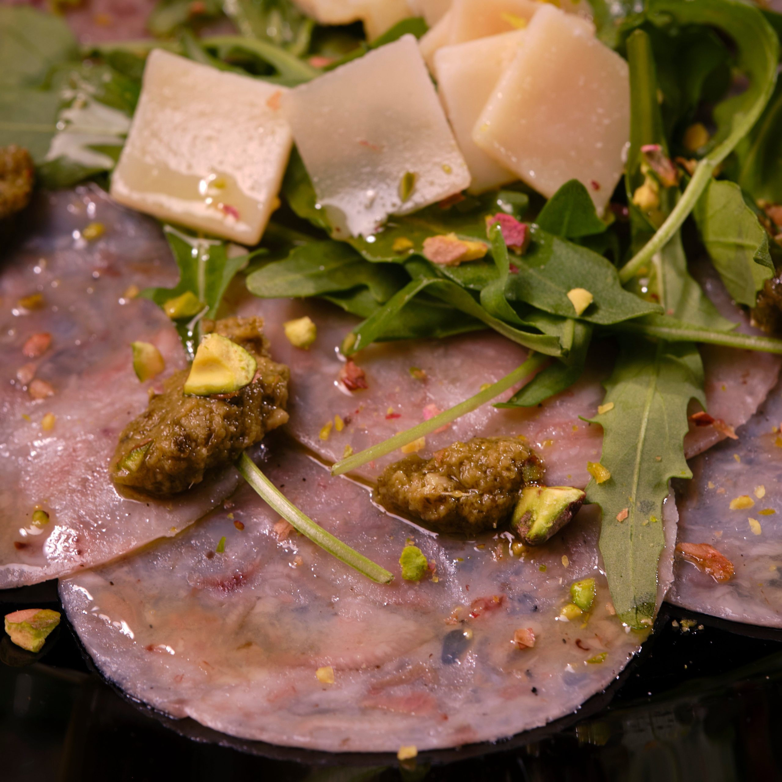 Manitas de cerdo condimentadas con sal y pimienta negra, cocinadas 24 horas a baja temperatura y deshuesadas a mano, presentadas en finas lonchas en forma de carpaccio para degustar como aperitivo, entrante o bien otras presentaciones.