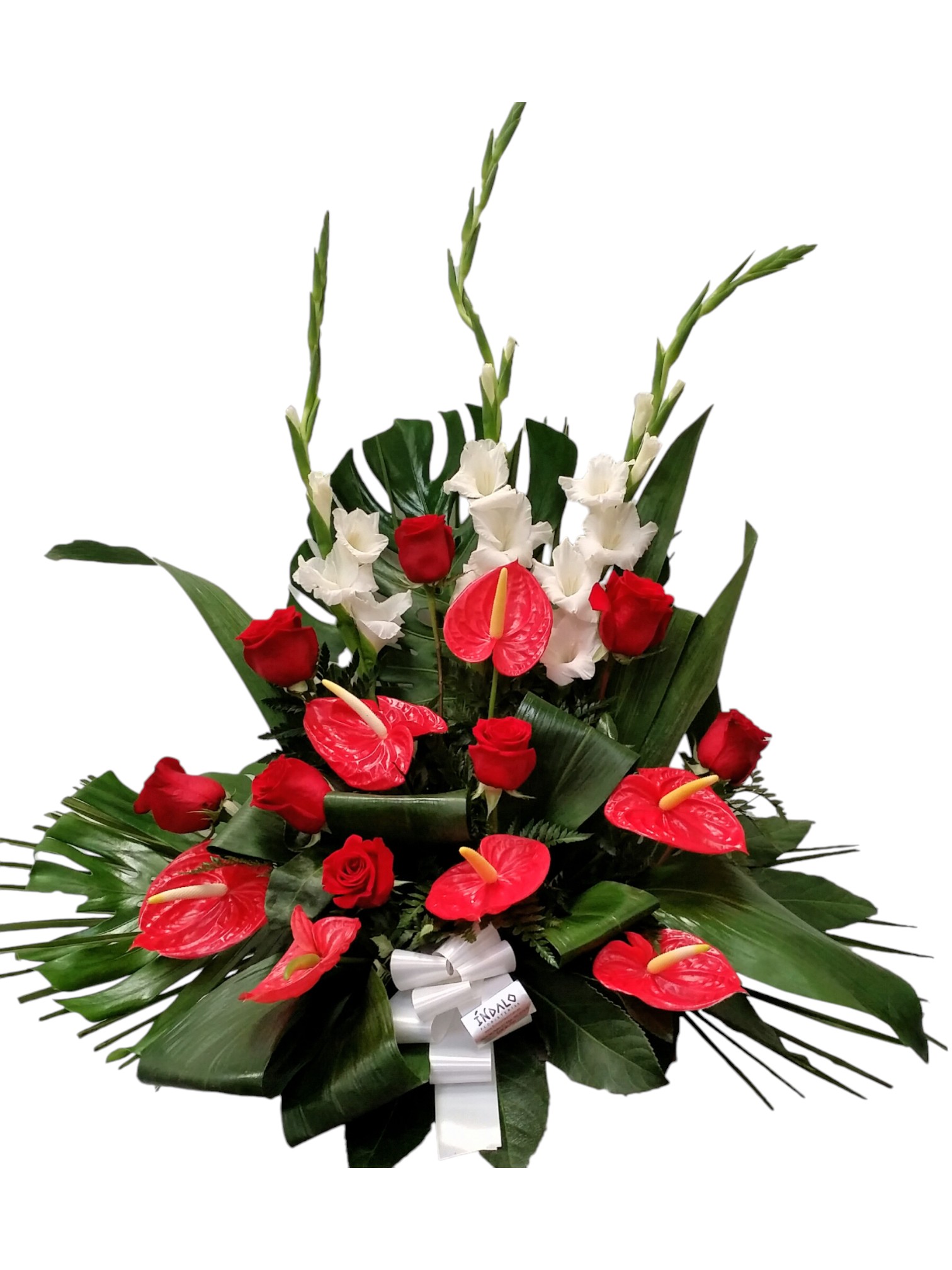 Centro funerario de rosas, gladiolos, anthurium y verdes variados.