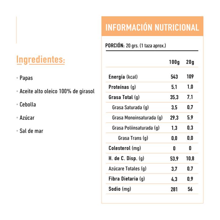 Al igual que en todos nuestros productos, aquí también usamos ingredientes 100% naturales; papas nativas frescas, aceite alto oleico 100% de girasol, cebolla caramelizada y sal de mar.
