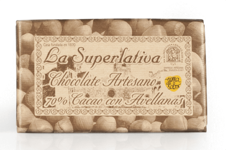 Ingredientes: Pasta de cacao, azúcar, avellanas (20%), manteca de cacao, aroma de vainilla.