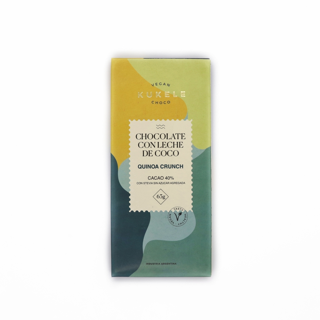 Ingredientes: Manteca de cacao, polvo de cacao, leche de COCO (Leche de coco, maltodextrina y almidón modificado (INS 1450) maltitol, EMU INS 322, EMU (INS 476), aromatizante de vainillina, edulcorante esteviol glicósido (INS 960), Quinoa Pop (harina de quinoa y azúcar organica). Sin agregado de azúcar. Contiene azúcares propias de los ingredientes.