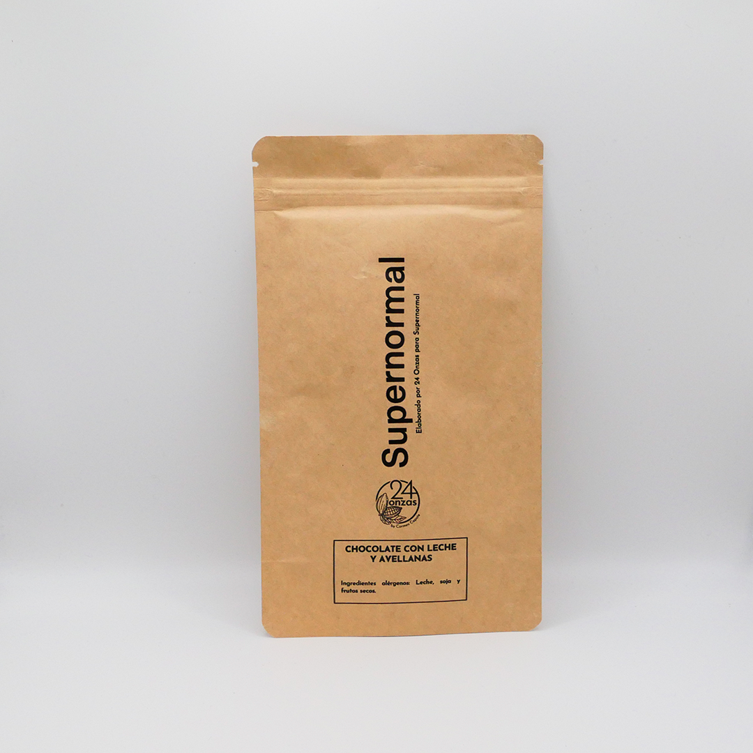 Chocolate con leche y avellanas elaborado por 24 onzas para Supernormal. Textura cremosa que combina estupendamente con el crujiente de las avellanas. Sabor dulce para los más golosos.