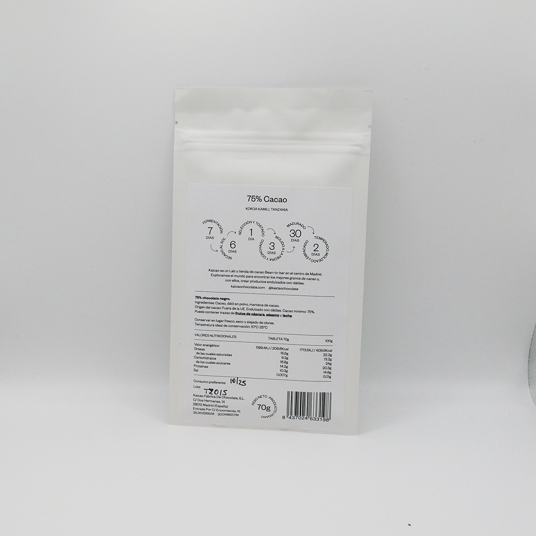 Tableta de chocolate elaborada por KAICAO en Madrid. Su sabor es para aquellas personas que buscan un chocolate original. Elaborado a partir de granos finos de cacao de Kokoa Kamili, Tanzania que aportan notas cítricas de frutas tropicales y especias egipcias junto a una mezcla de frutos secos a base de semillas de cilantro, hinojo, canela, sal, pistachos, avellanas y sésamo.