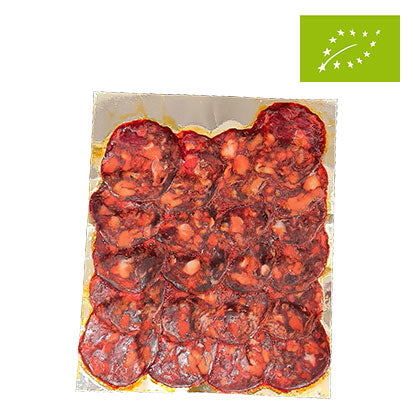 Ingredientes: cerdo ibérico de bellota 100% ecológico, sal, pimentón ecológico, ajo ecológico