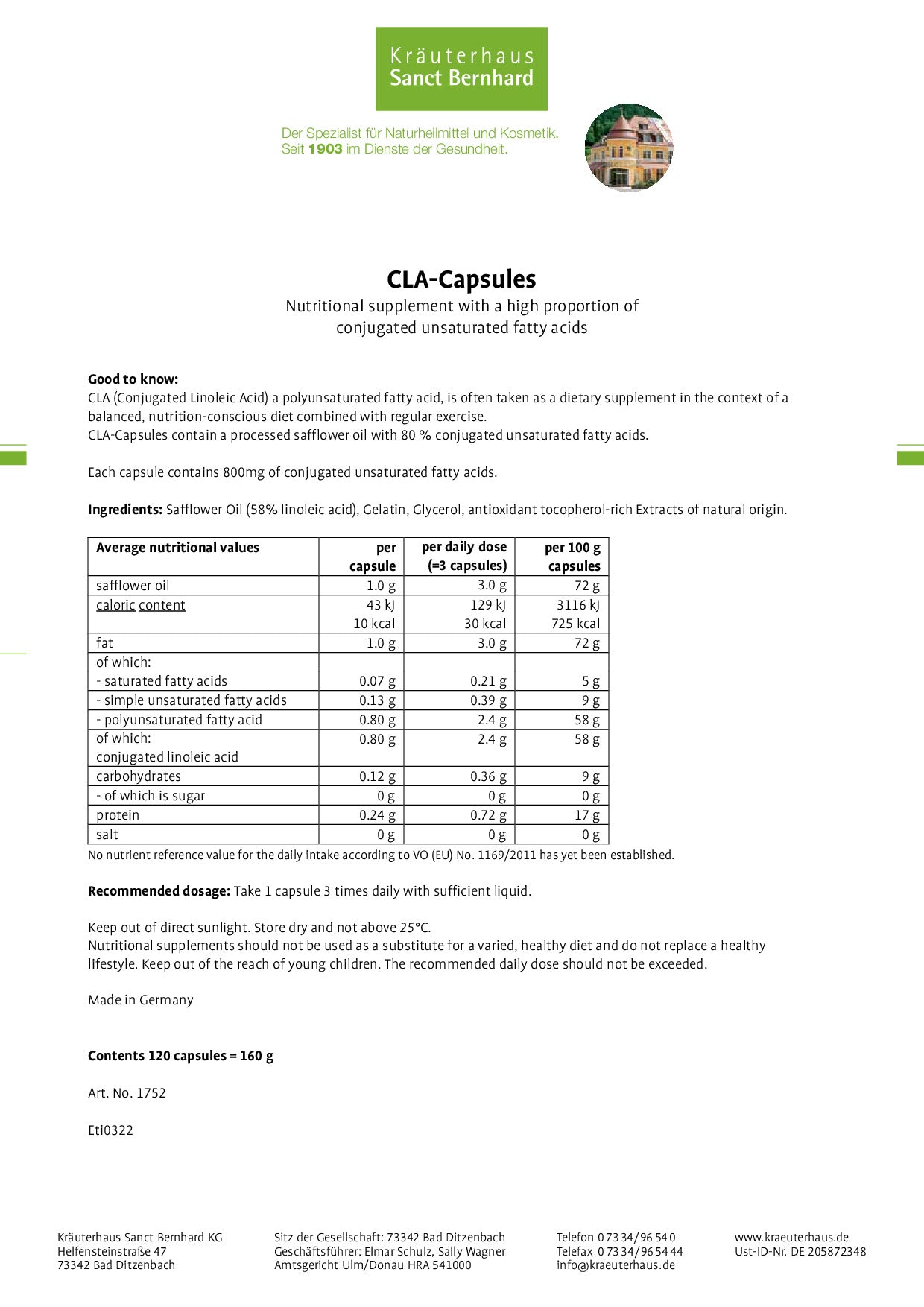 CLA KAPSELN de la marca SANCT BERNHARD en formato de 120 cápsulas.