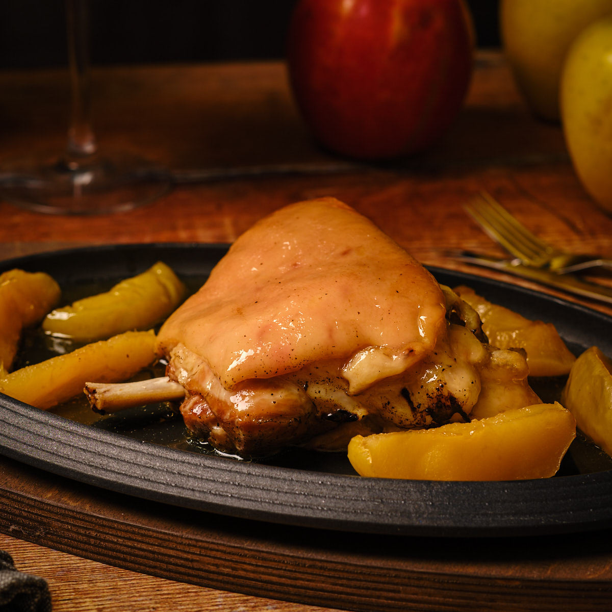 Delicioso codillo de cerdo asado durante 24 horas en su propio jugo a baja temperatura (sous vide). Producto de sabor intenso y aromático, muy popular en la gastronomía alemana.