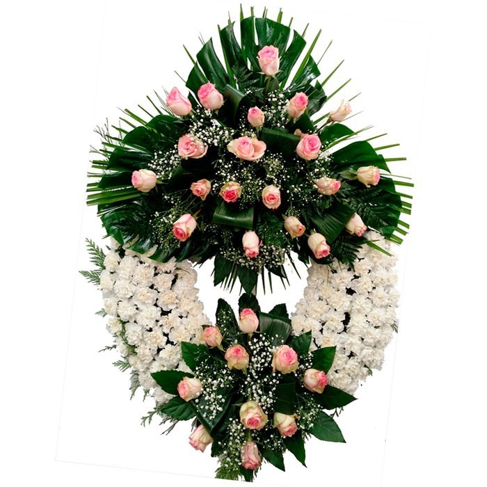 Corona con dos cabezales de rosas y aro con claveles de color blanco.