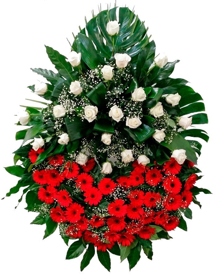 Corona con un cabezal de rosas blancas y aro de claveles o gerberas de color rojo.