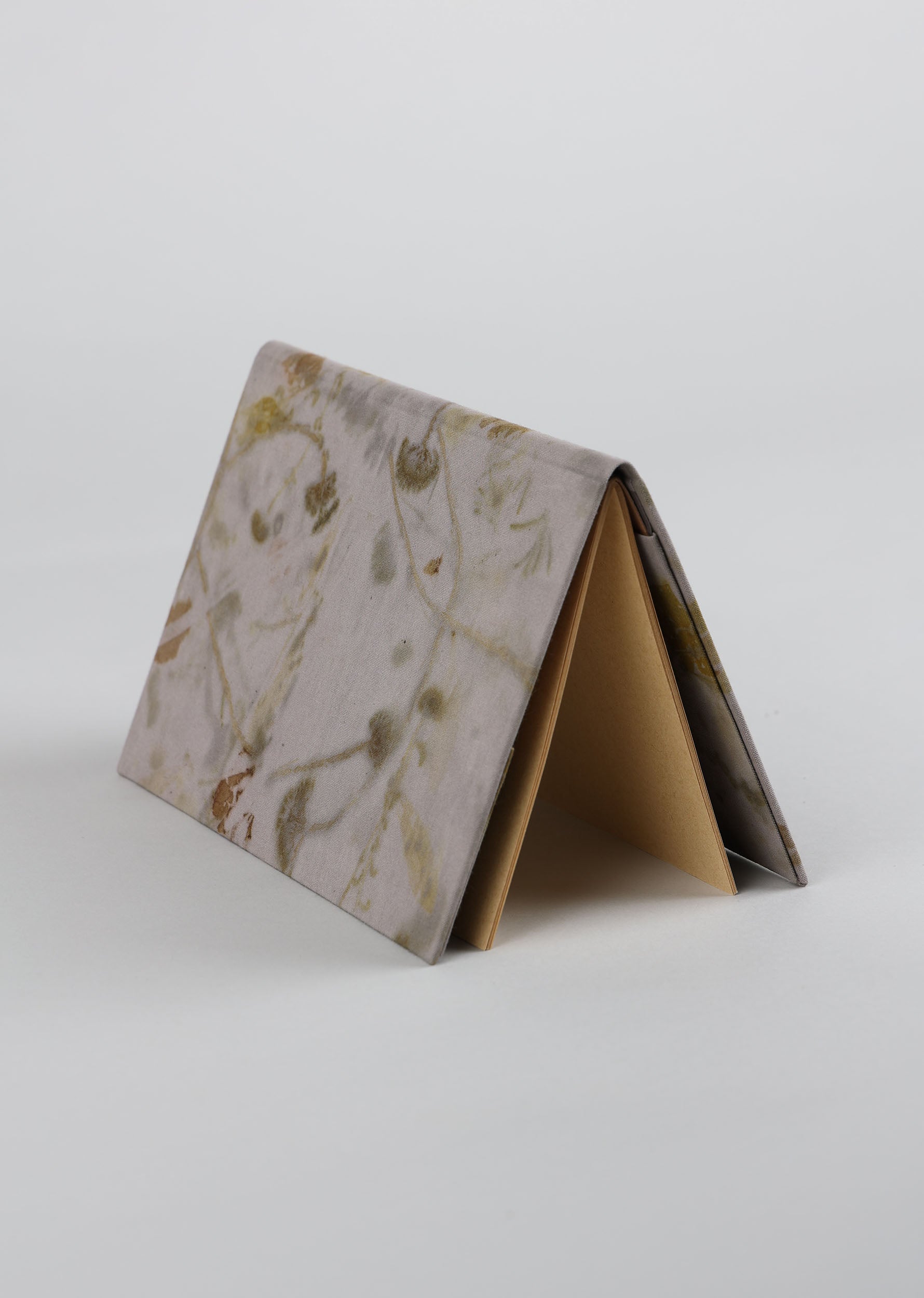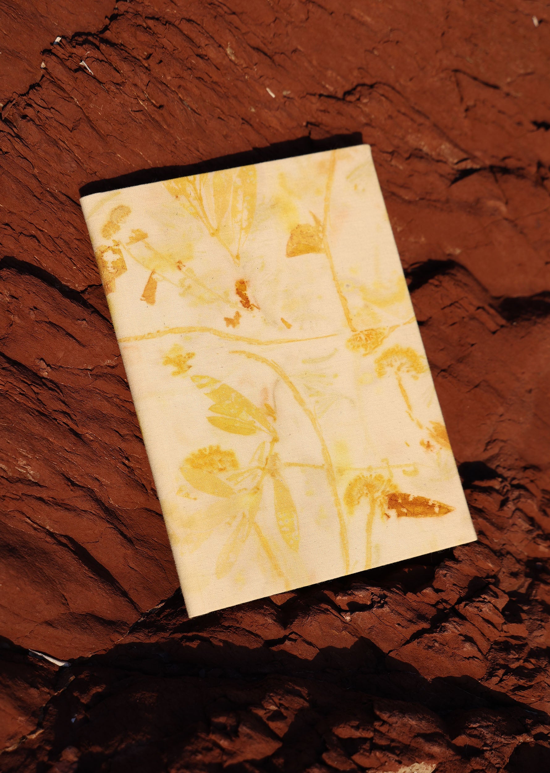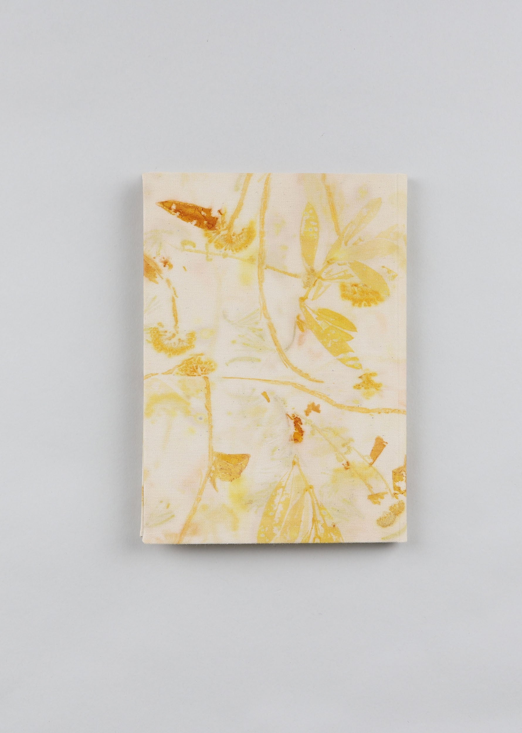 Cuaderno de campo encuadernado a mano con cubiertas de algodón teñidas con tintes naturales de estampación botánica en el taller de SONMO. Las cubiertas son independientes del cuadernillo interior, por lo que éste puede reemplazarse por otro nuevo una vez completado.