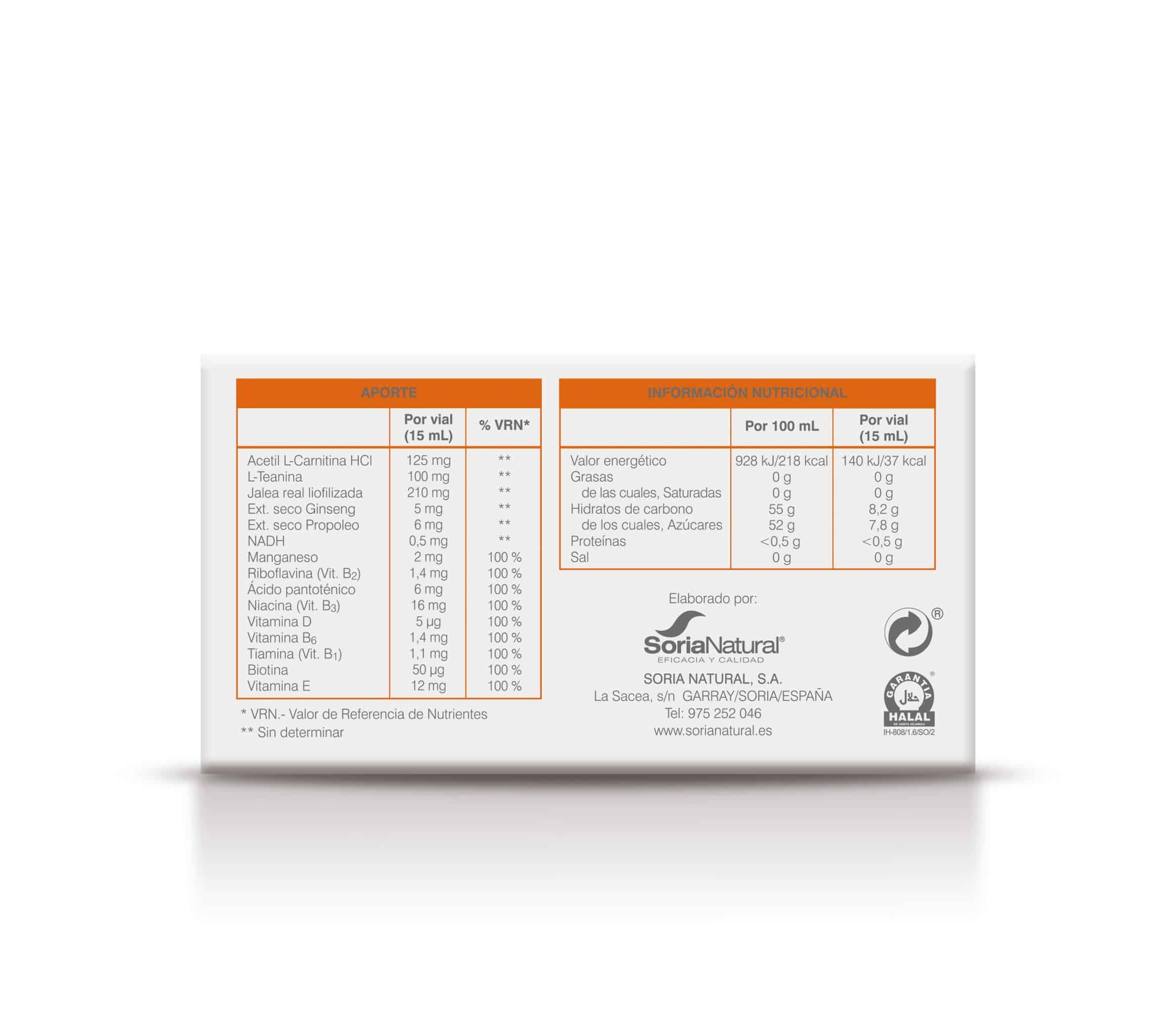 Vial: Glucosa, fructosa, jalea real fresca (mínimo 2.100 mcg de ácido 10-hidroxidecenoico/vial), ginseng (mínimo 2.100 mcg de ginsenósidos/vial), propóleo (mínimo 160 mcg de galangina/vial); magnesio, potasio, fósforo, calcio, vitamina C, vitamina E, vitamina D3, vitamina B12, cromo; arginina, glicina, aroma natural de mandarina, regulador de acidez: ácido cítrico, conservante (sorbato potásico) y agua glicerinada.