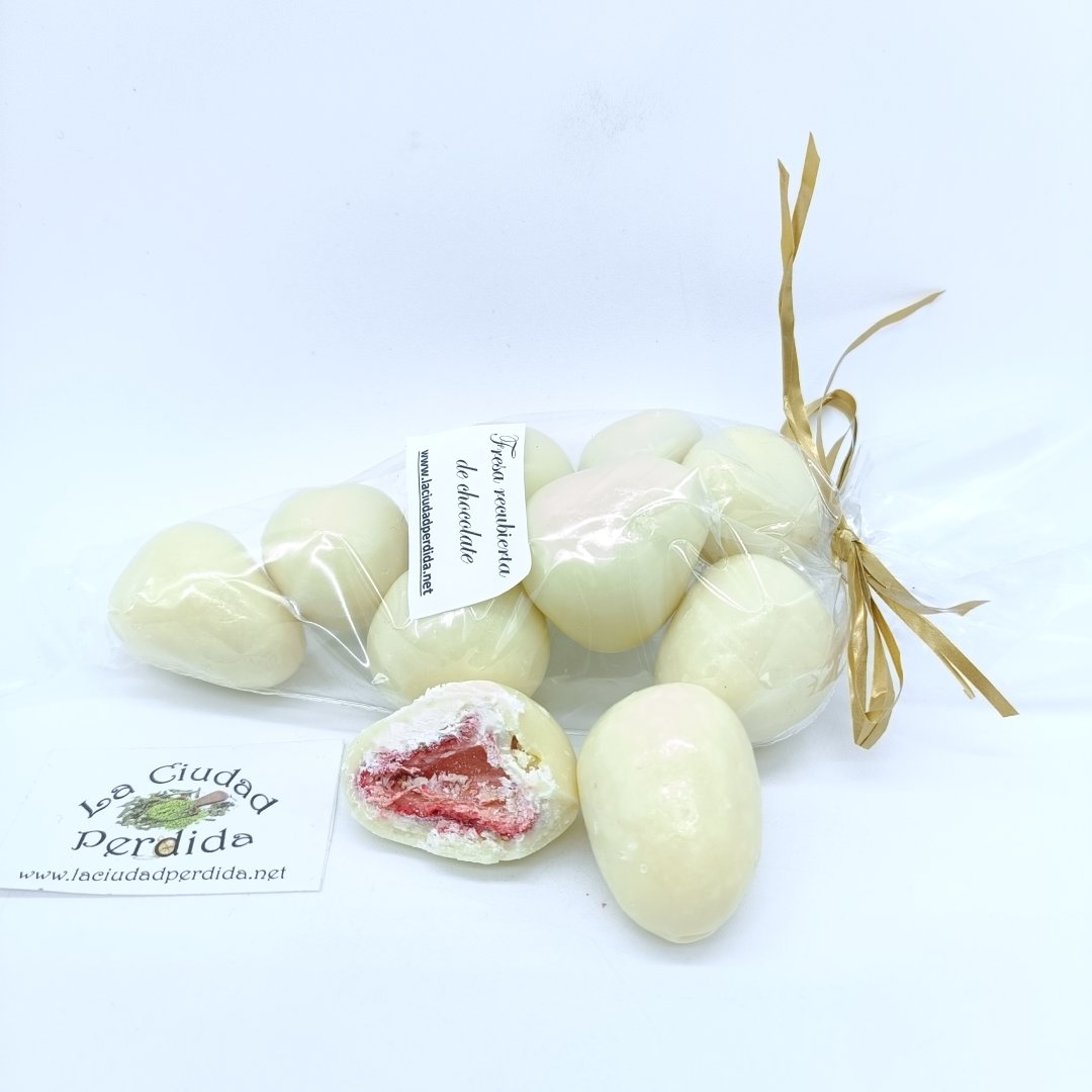 Ingredientes de fresa deshidratada recubierta de chocolate blanco: chocolate blanco (91%) (azúcar, manteca de cacao, leche entera en polvo, suero en polvo, emulsionante: soja-lecitina, aroma de vainilla), fresas liofilizadas (5%) (fresas, aceite de girasol), jarabe de glucosa, polvo de Jogurt (leche, lactosa), aroma de yogurt, dextrina, agente de recubrimiento: goma arábiga, agente de recubrimiento: goma laca, aceite de coco, aceite de colza.