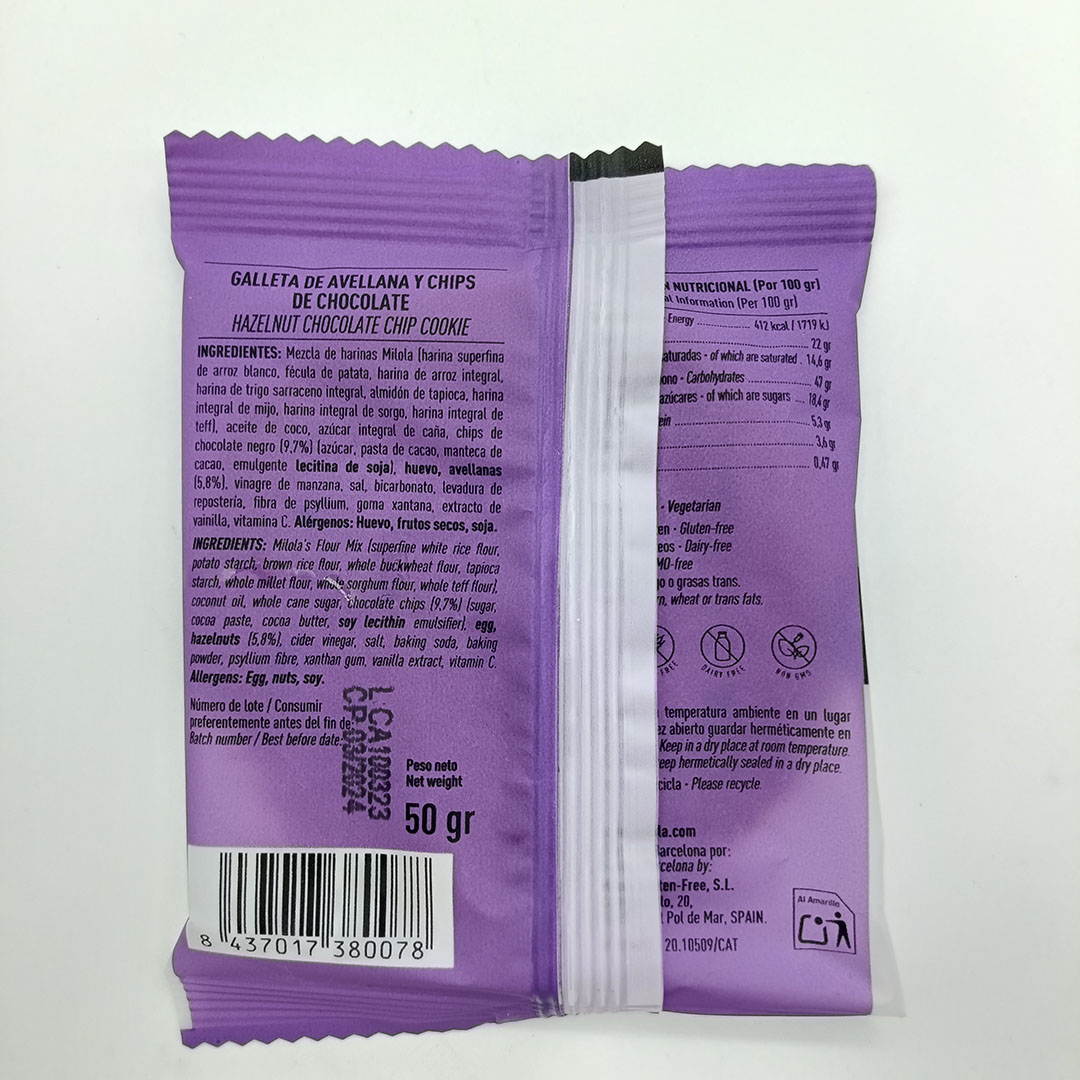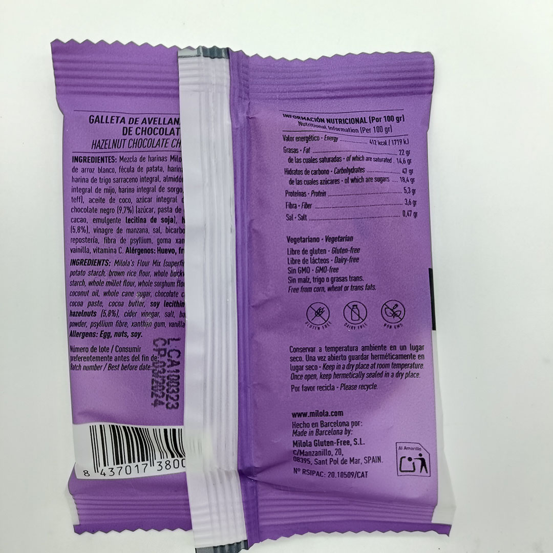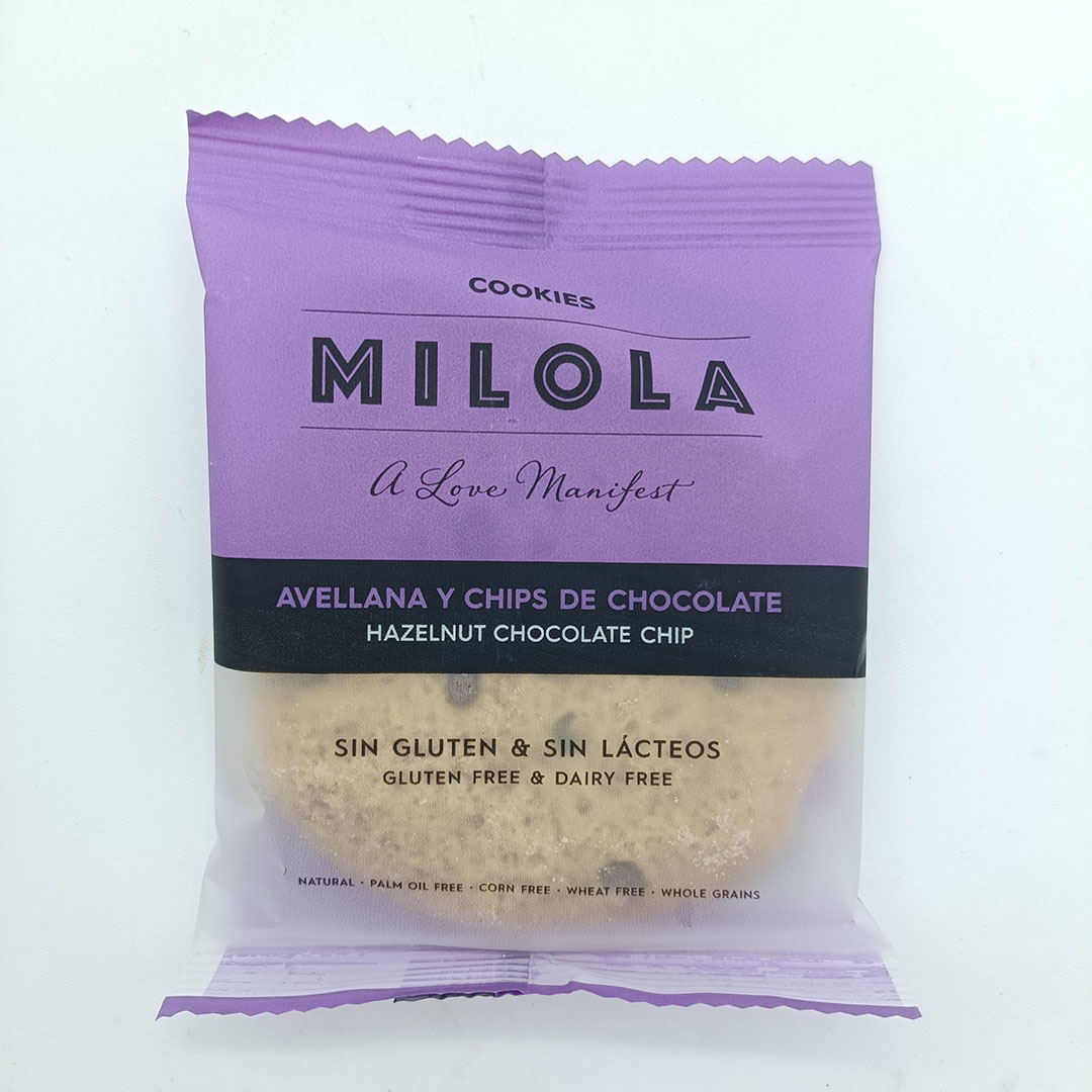 Galleta sin gluten y sin lactosa milola de avellana y chips de chocolates. Peso 50gr.