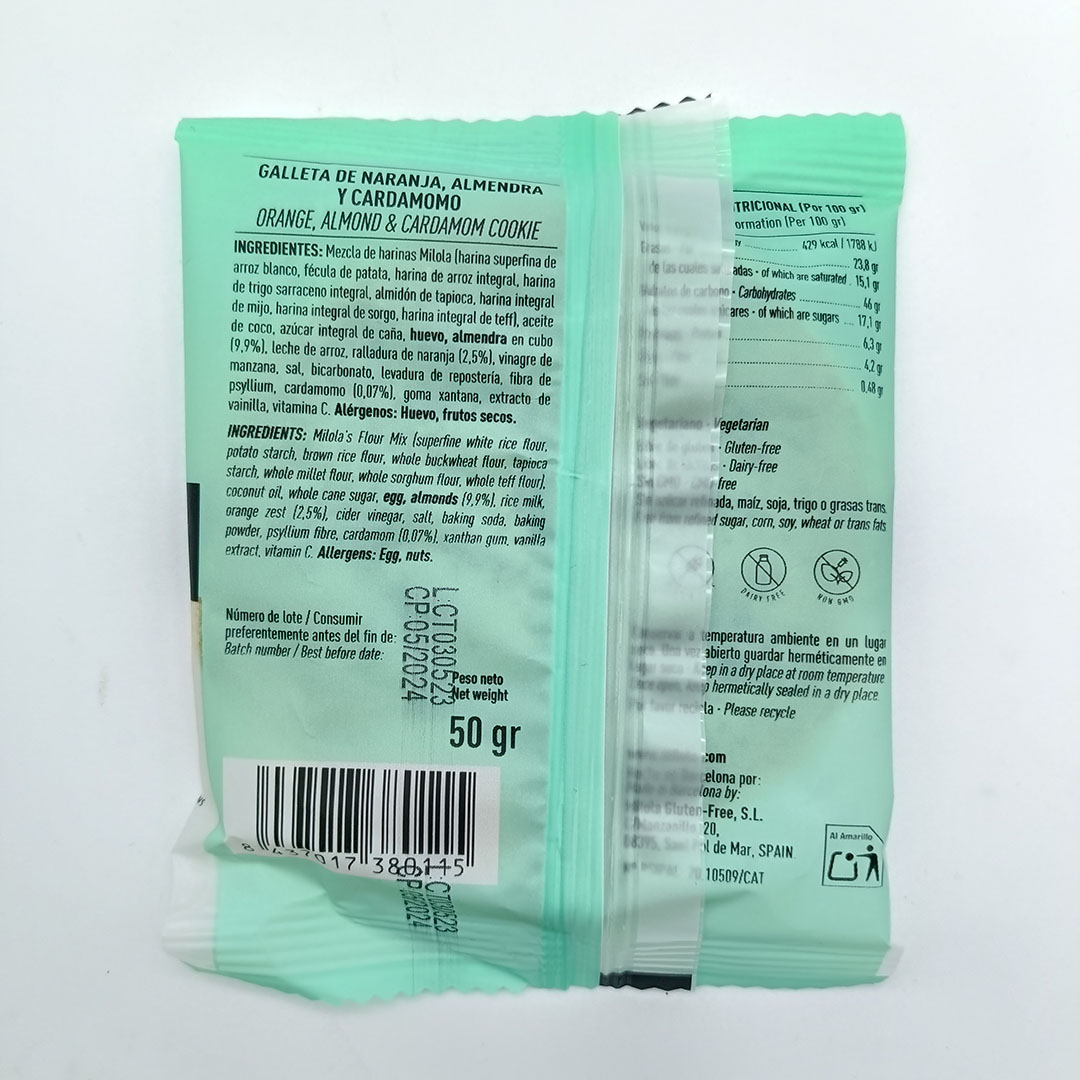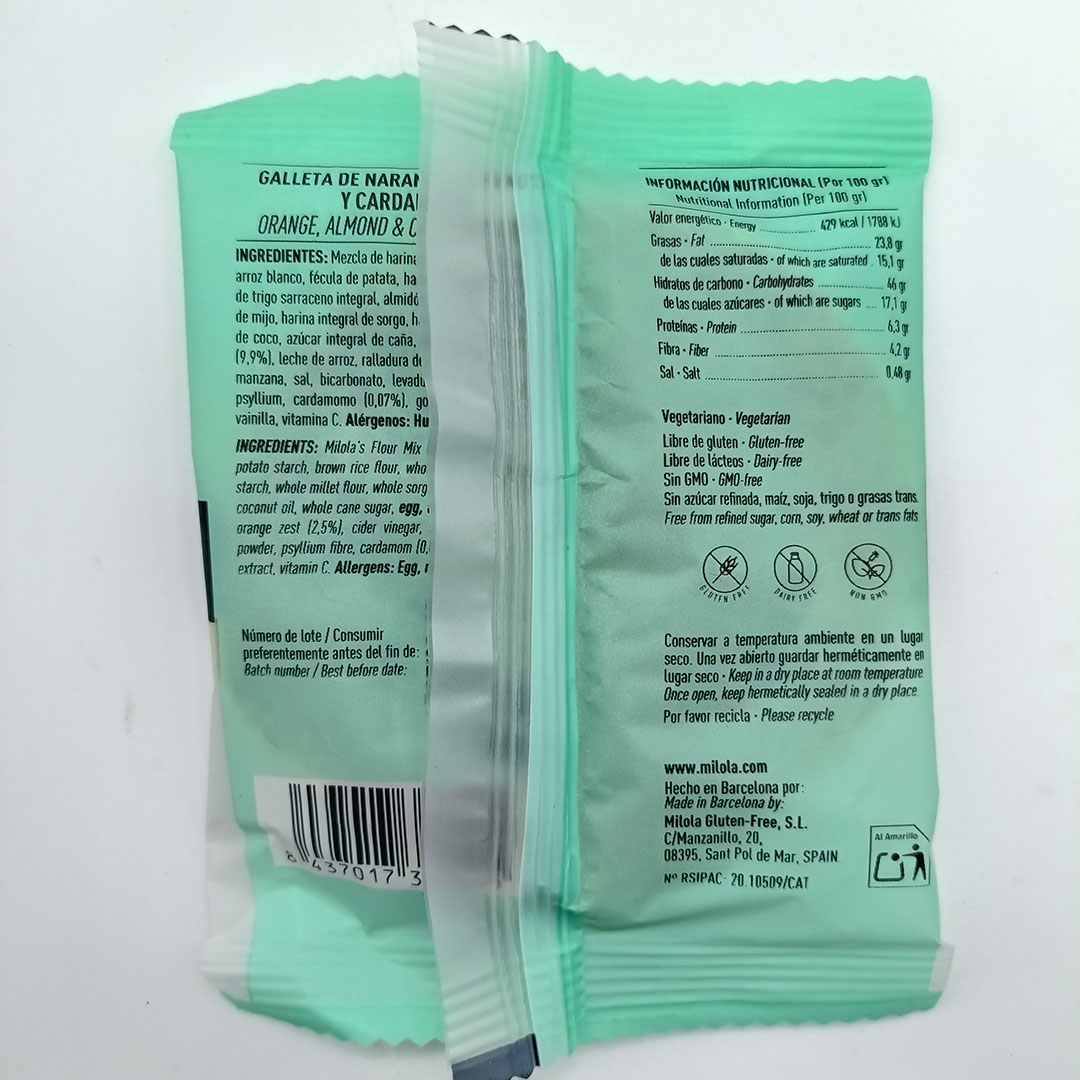 Galleta sin gluten y sin lactosa milola de naranja, almendra y cardamomo. Peso 50gr.