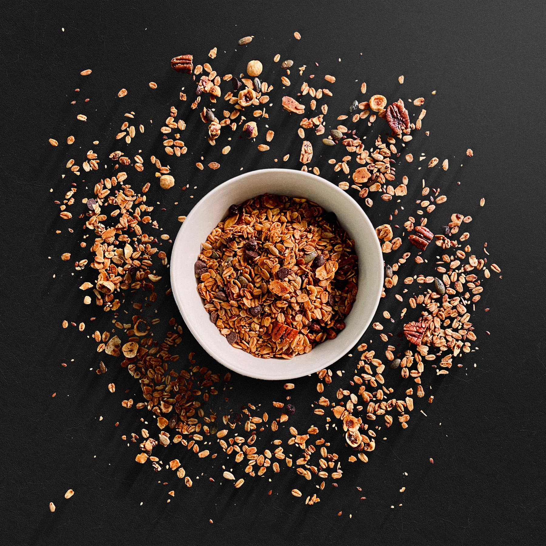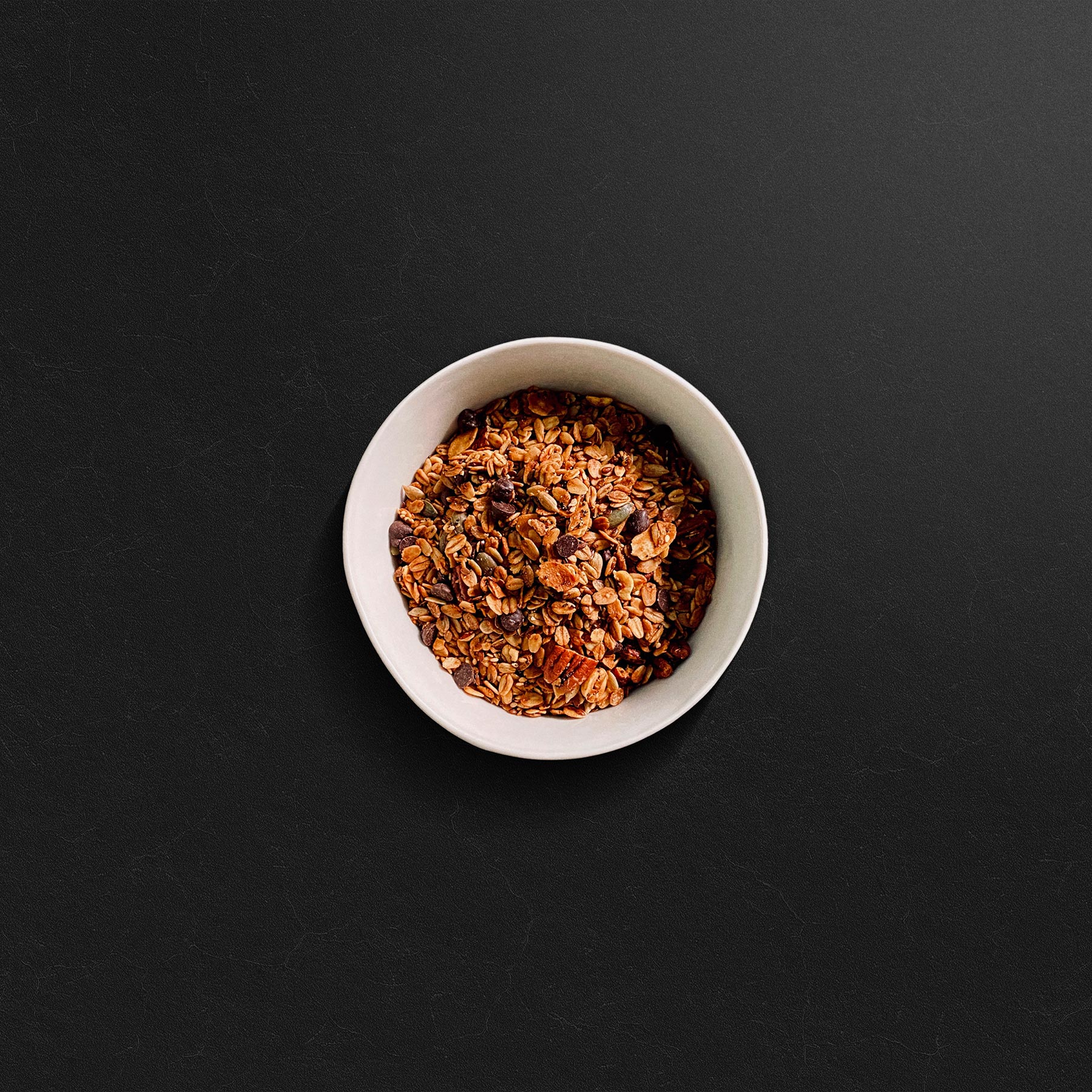Avena, chocolate 70%, avellanas, pasas, semillas de lino, nueces, azúcar integral