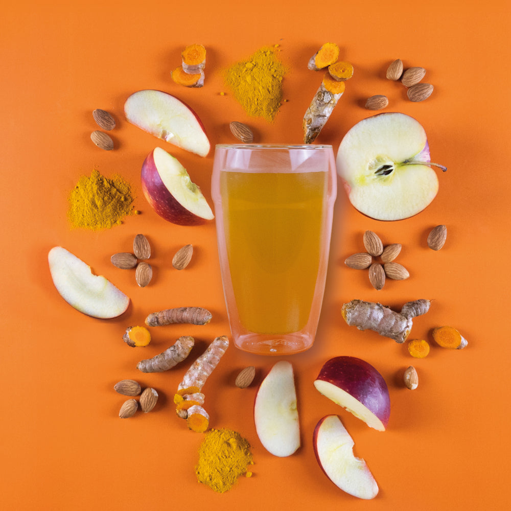 Una bebida de color vivaz y con mucha personalidad aromática. Una sabia alquimia entre placer y salud, equilibradamente dulce y especiada con ligeras notas picantes. La calidez de la cúrcuma, el anís estrellado y la canela envuelve el dulzor de la manzana y la almendra. Una infusión energética para combatir el cansancio y naturalmente sin teína. Su sabor cálido y ligeramente picante la hace perfecta para prepararse en infusión o en decocción; para disfrutarla en cualquier momento del día, tanto en caliente como con hielo. Agregándole leche o bebida vegetal obtenemos un perfecto «Golden milk» natural y repleto de propiedades ayurvedas. La infusión en seco puede utilizarse molida para sazonar los platos típicos de la cocina hindú. Infusión tónica y estimulante sin teína, con múltiples beneficios para la salud: estimula la circulación, favorece la digestión, es antioxidante y contribuye a mantener la salud del sistema cardiovascular e inmunitario, gracias a la combinación de especias ayurvédicas, fruta y frutos secos.