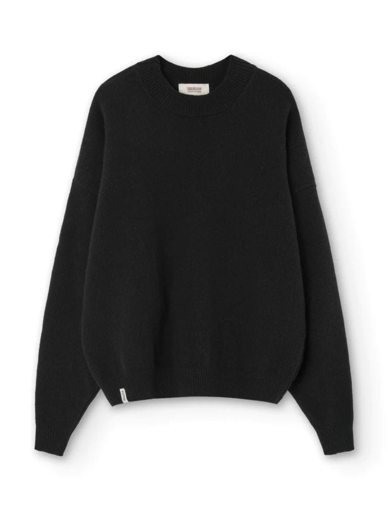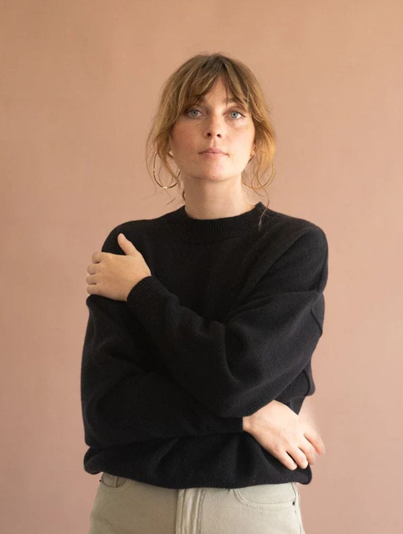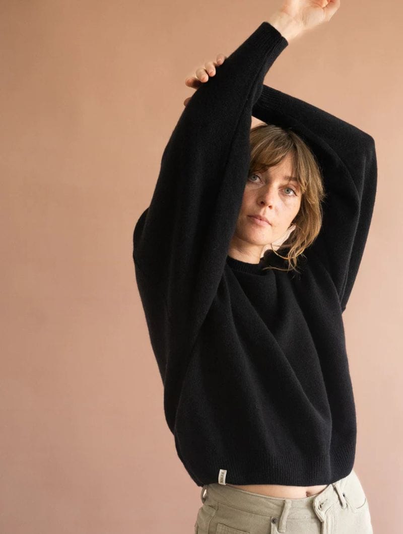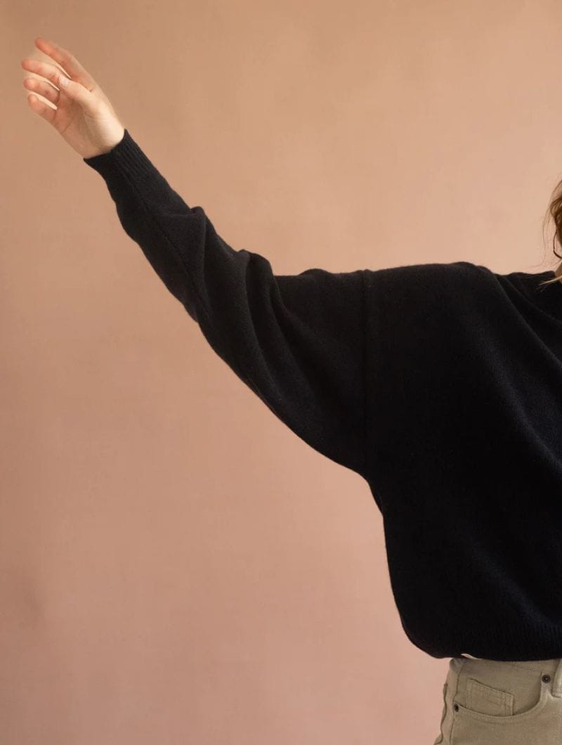 Jersey manga murciélago negro, tejido en lana merino suave y ligera. Estilo oversize disponible en dos tallas para un ajuste perfecto.