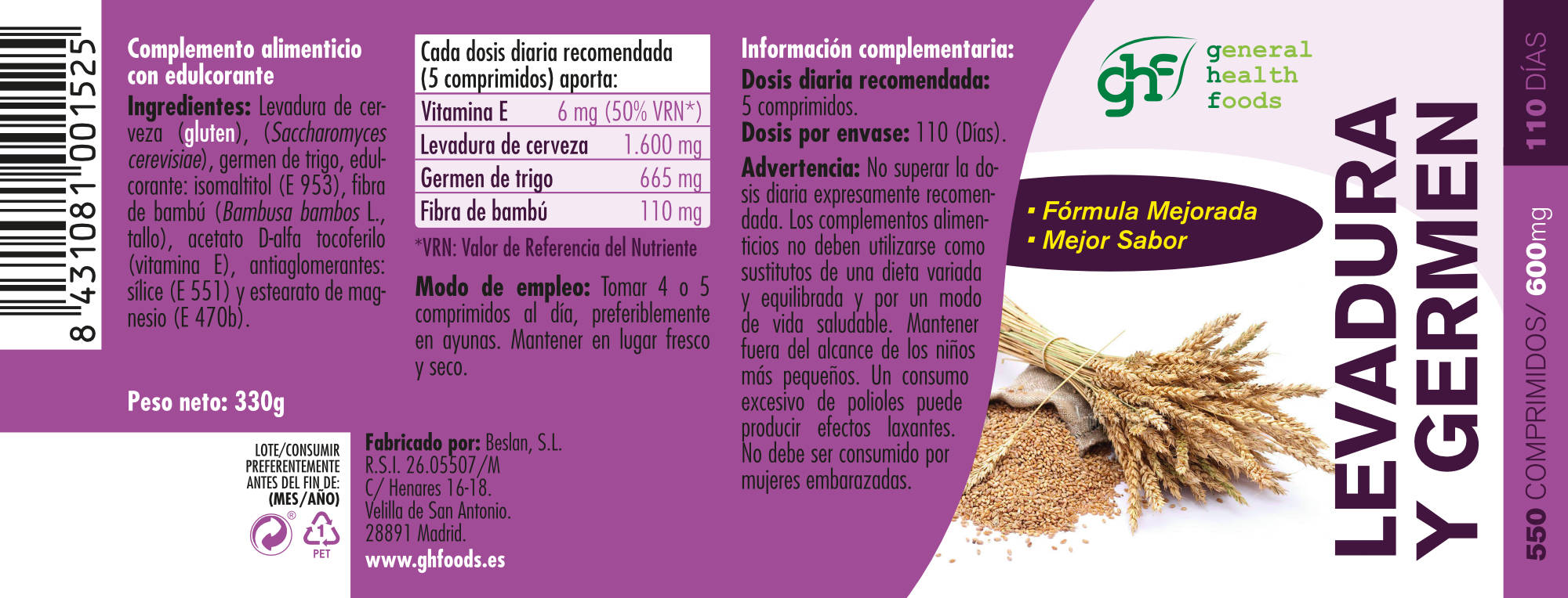550 Comprimidos de 600mg. Peso neto 330g. |