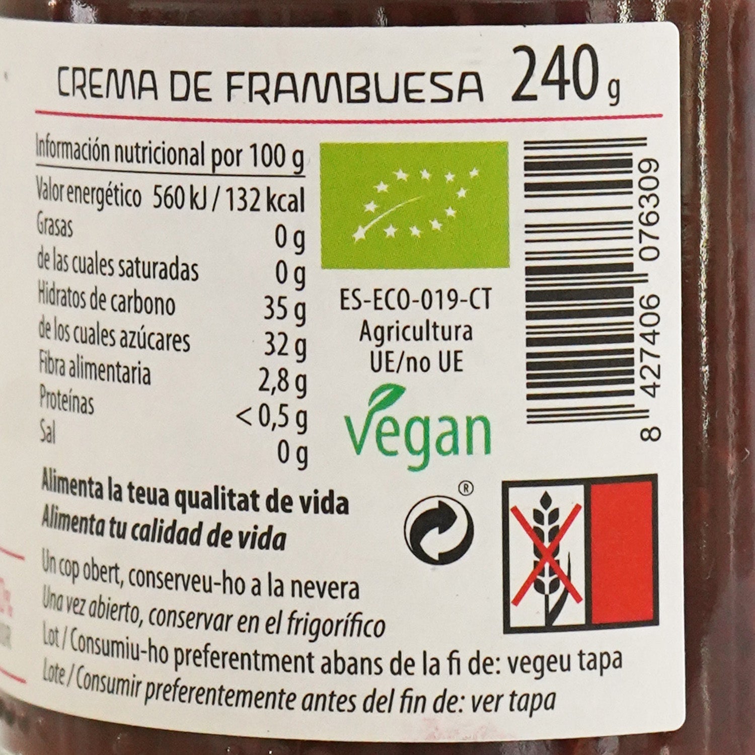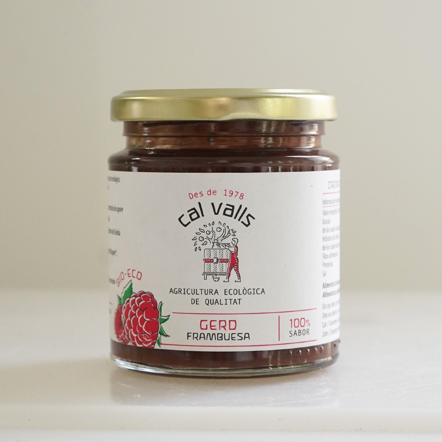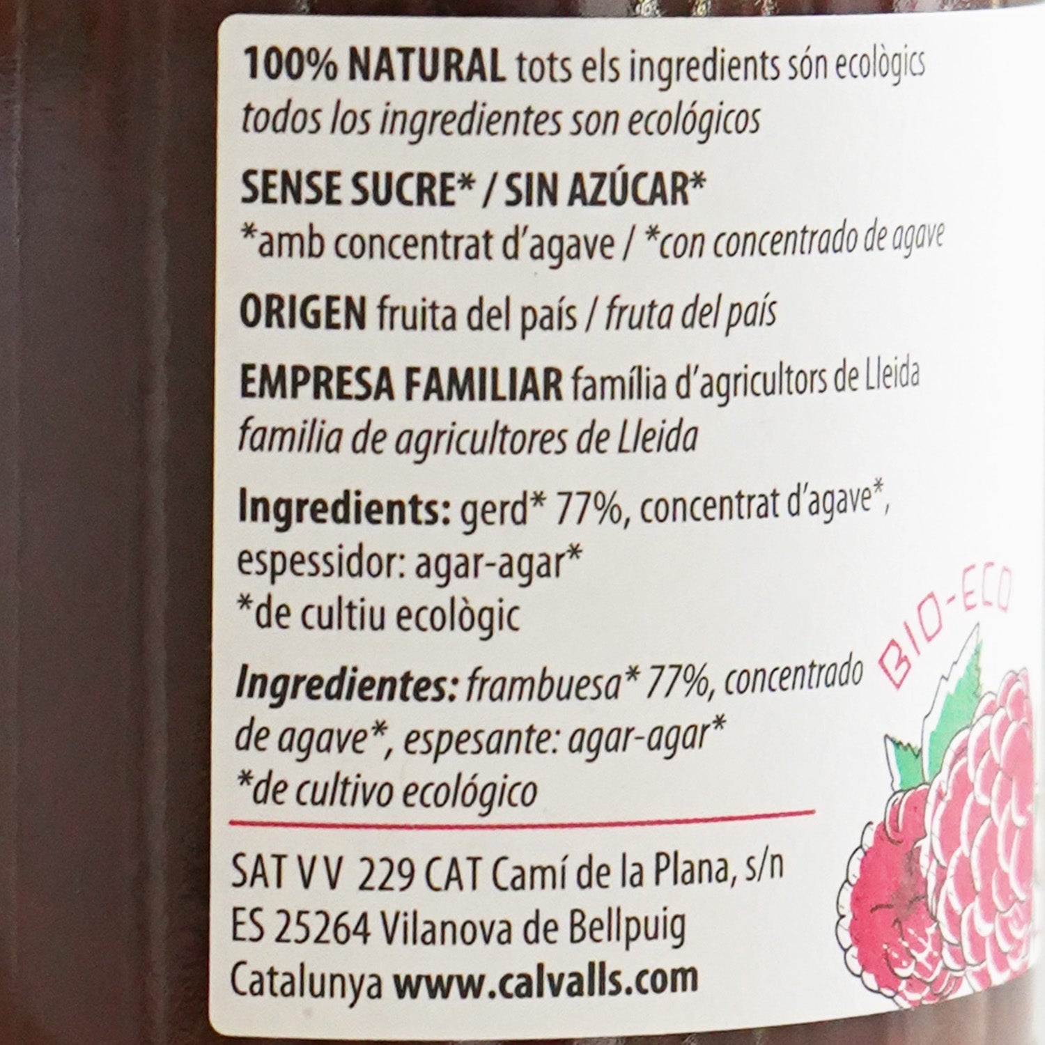Mermelada de frambuesa ecológica, elaborada sin azúcar, por Call Valls en Lérida. Para su elaboración se utilizan únicamente frambuesas del país en su momento óptimo de maduración para aprovechar todo su sabor.