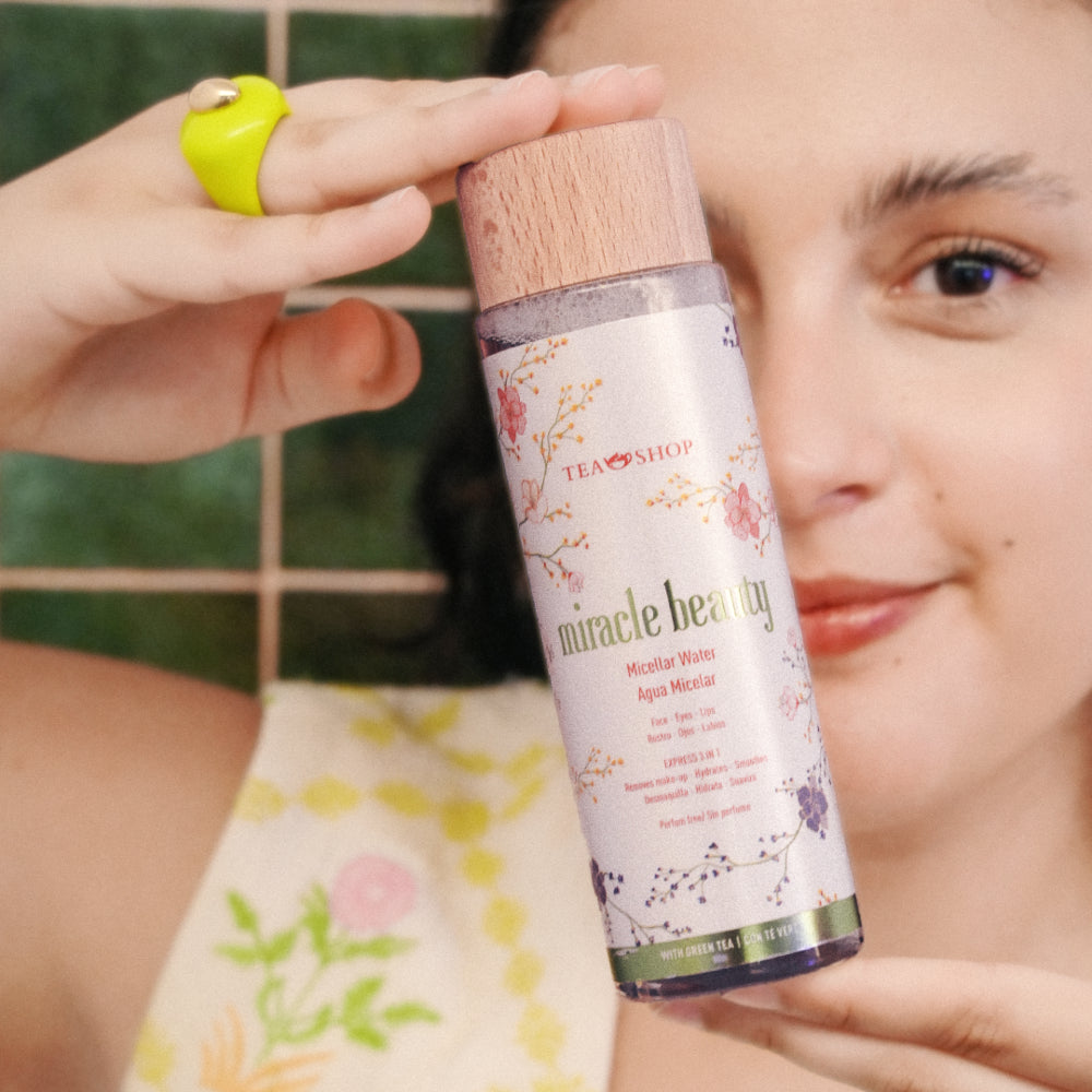 Agua micelar de la primera línea de cosmética de Tea Shop, apta para todo tipo de pieles, que elimina eficazmente las impurezas del rostro, ojos, labios, cuello y escote. No solo desmaquilla, sino que también hidrata y suaviza la piel con cada aplicación. Su fórmula a base de extracto de té verde y con un 96% de ingredientes de origen natural, contribuye a preservar la belleza y la juventud de la piel, así como a mantener su hidratación natural. Al ponerse en contacto con la piel, las micelas se abren y son capaces de retener en su interior los residuos y las impurezas de la piel, mayoritariamente de naturaleza grasa. A su vez, la parte acuosa de la solución hace el efecto de tónico limpiador, arrastrando las impurezas. Así pues, se trata de un producto con mucha eficacia limpiadora, muy ligero, que no deja restos grasos y que no necesita aclarado.