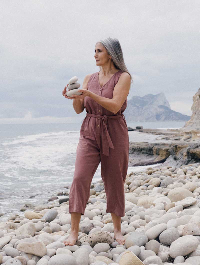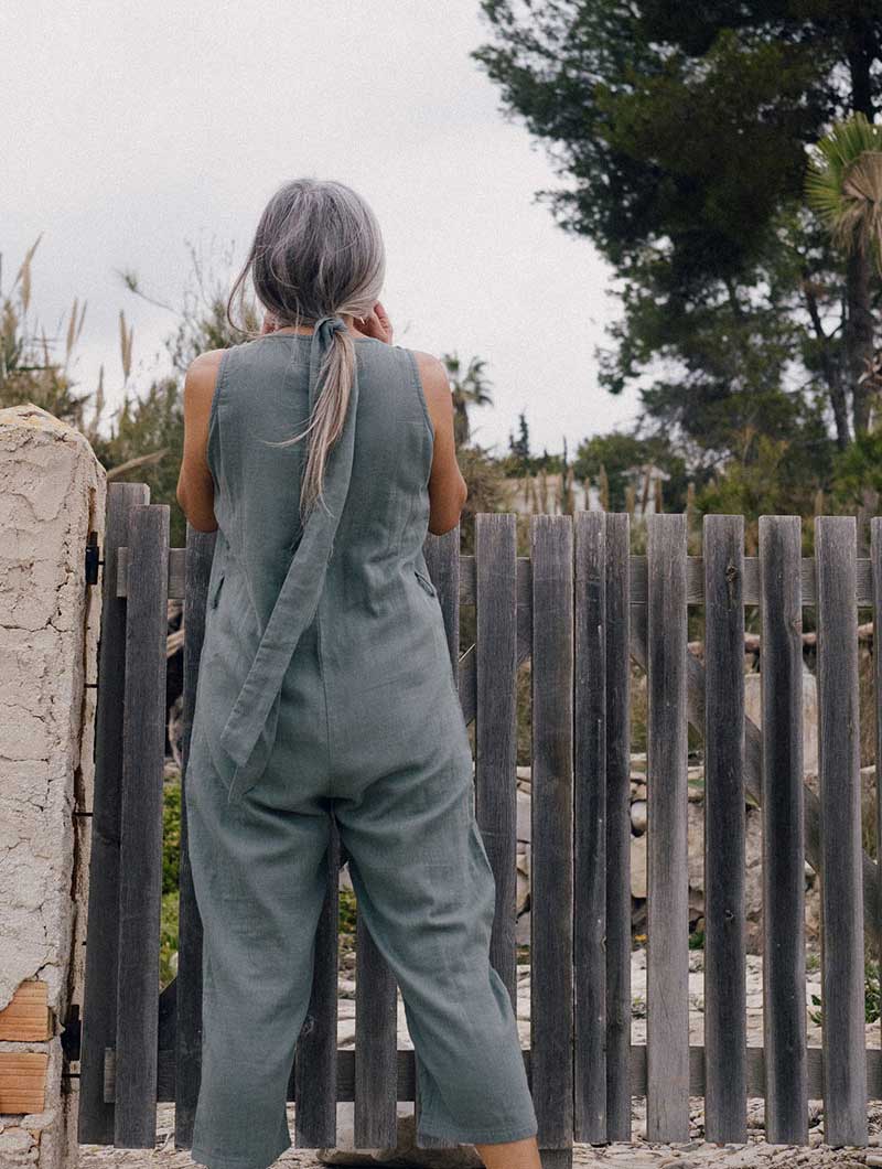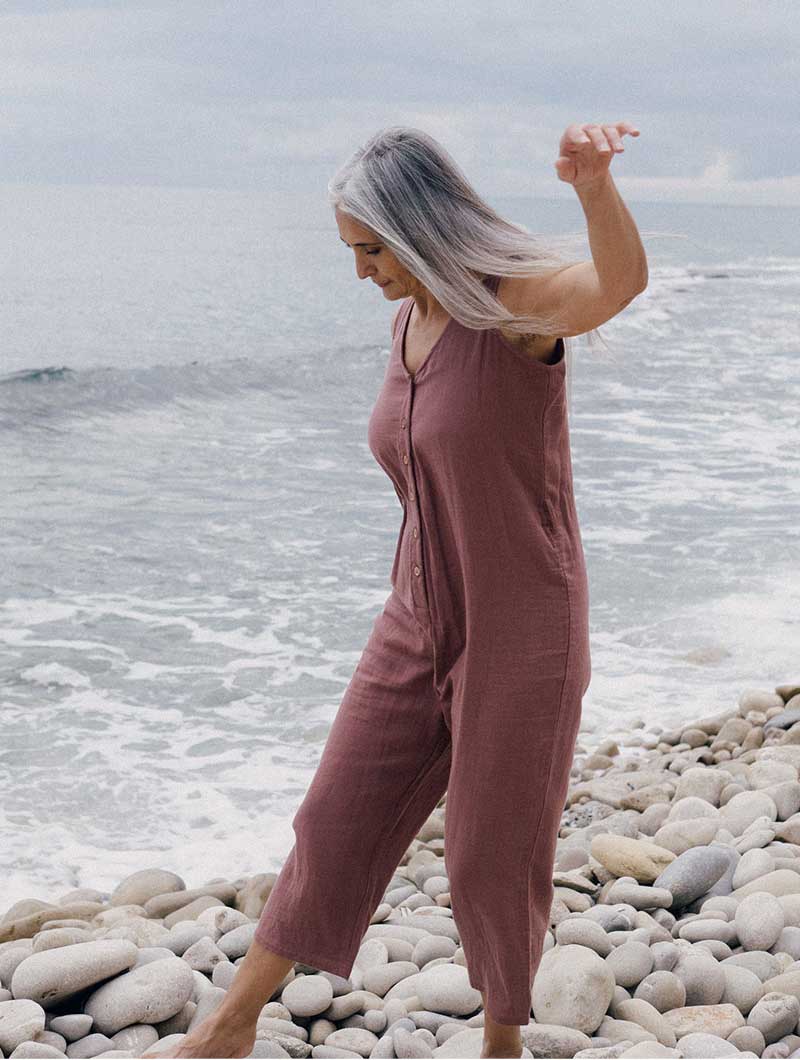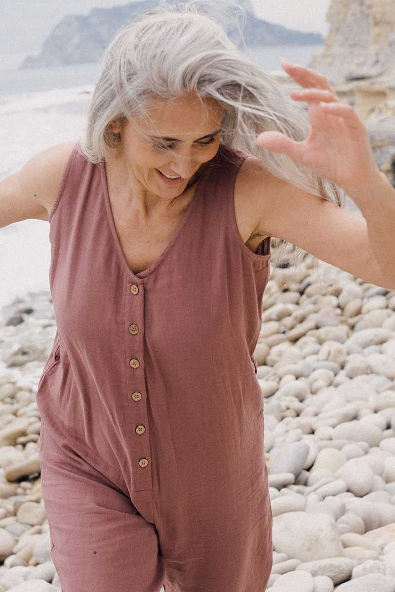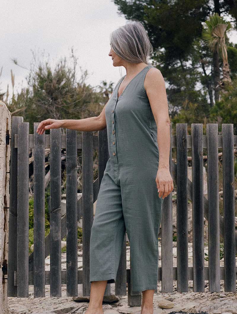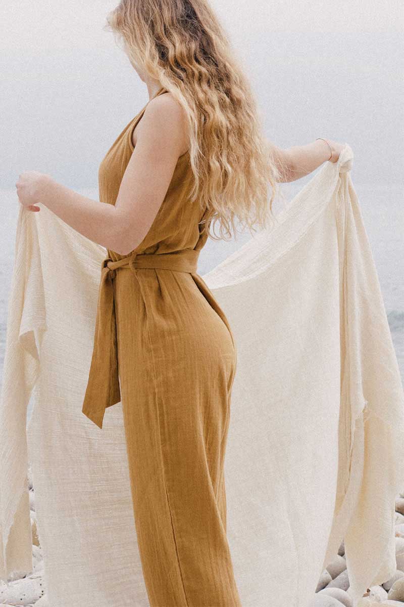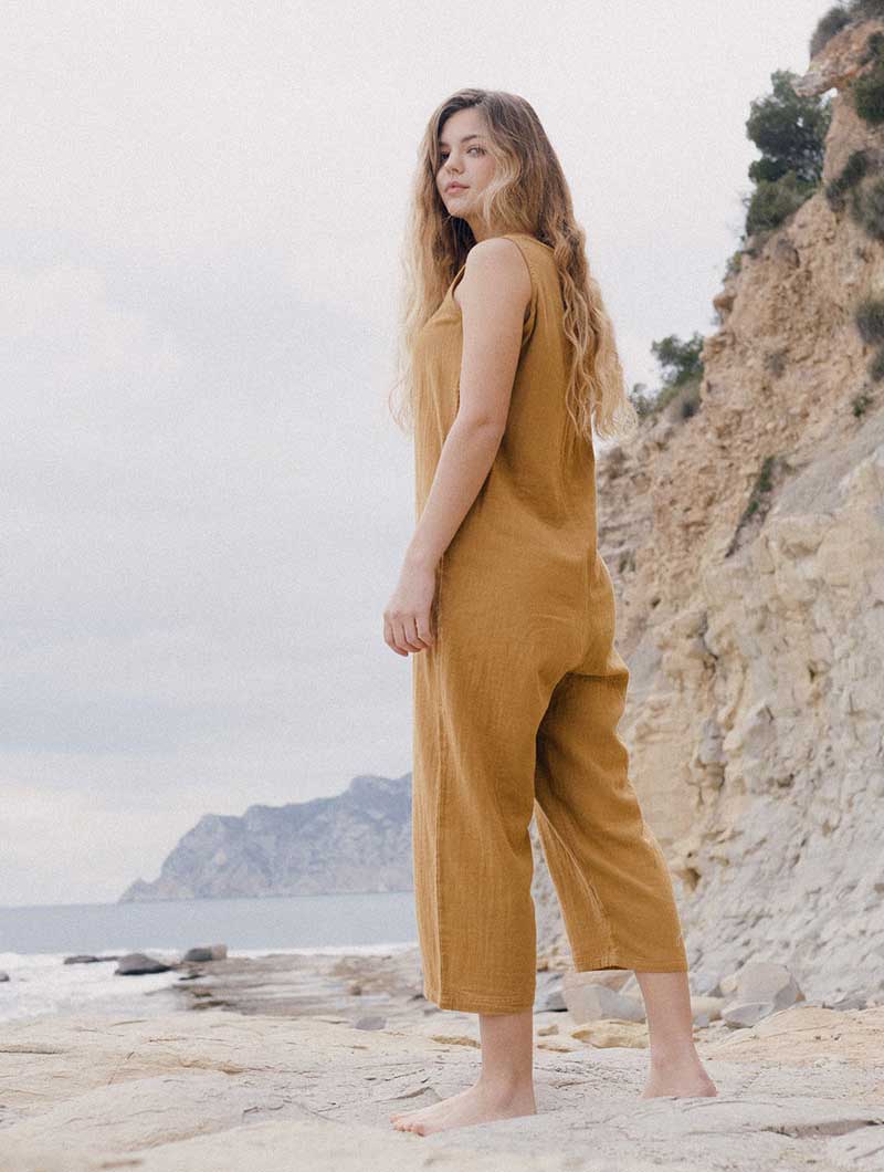 Los monos mujer están fabricados en muselina 100% algodón orgánico certificado GOTS y tintes ecológicos. El sello GOTS garantiza que en la fabricación se tienen en cuenta estrictos criterios éticos y ambientales.