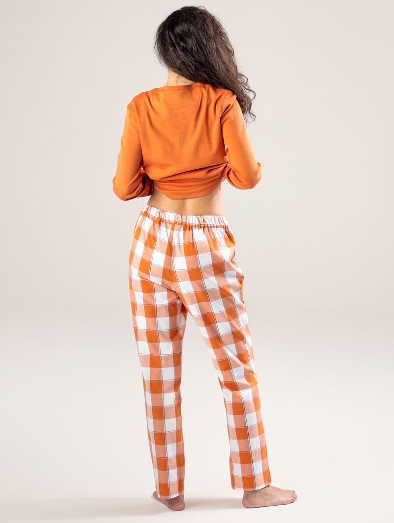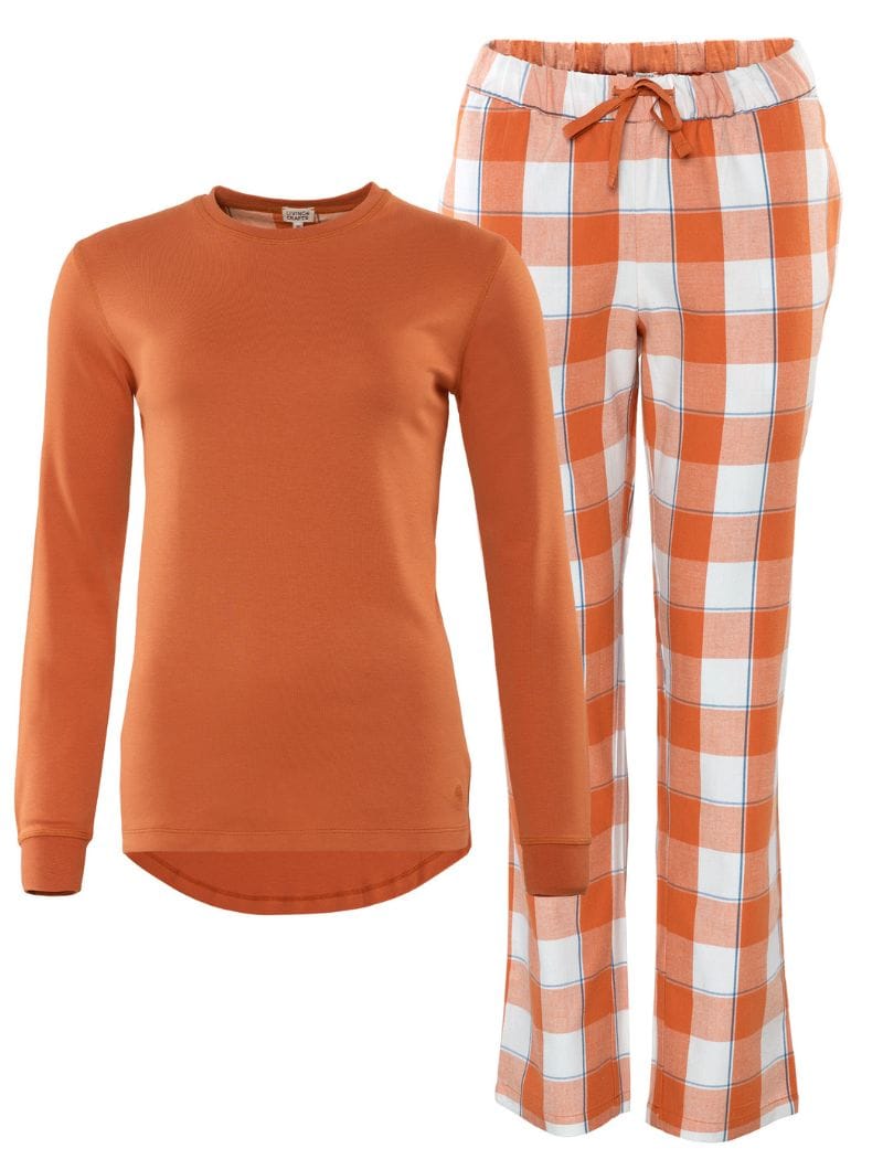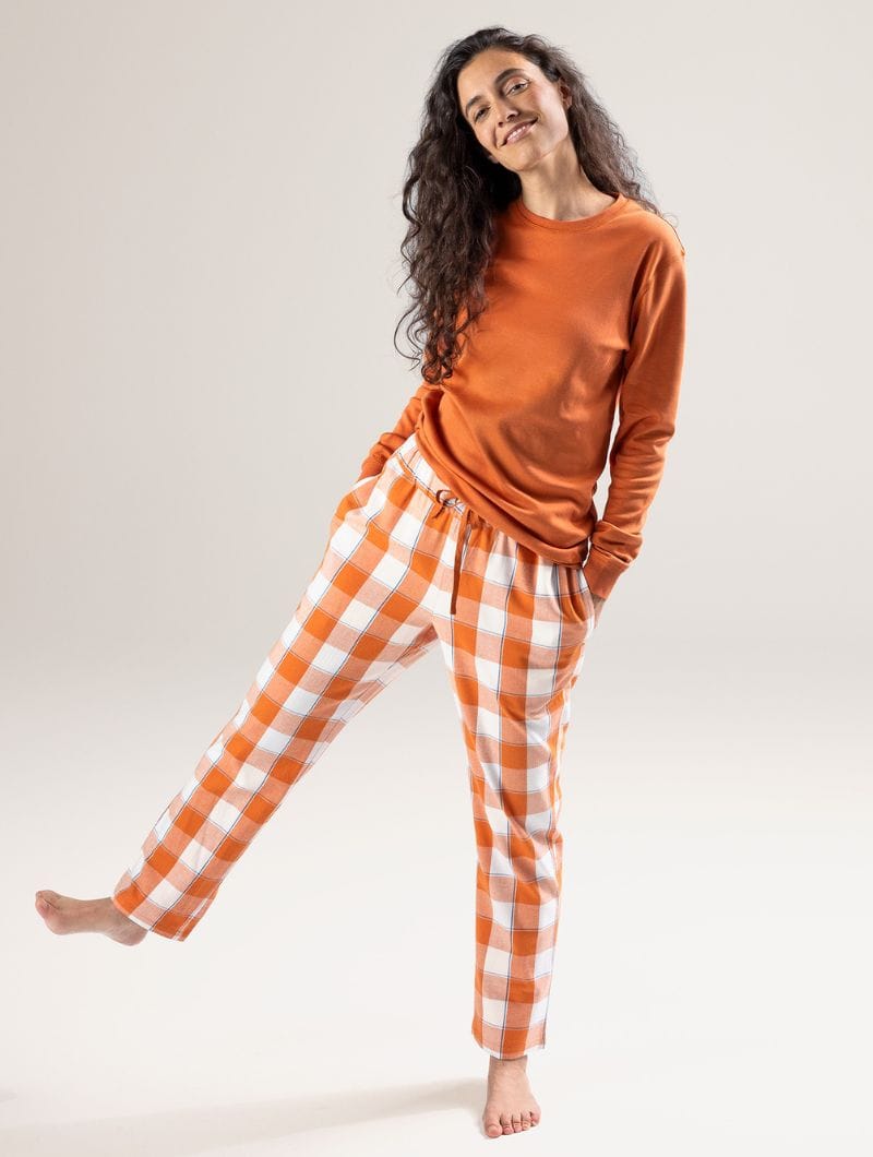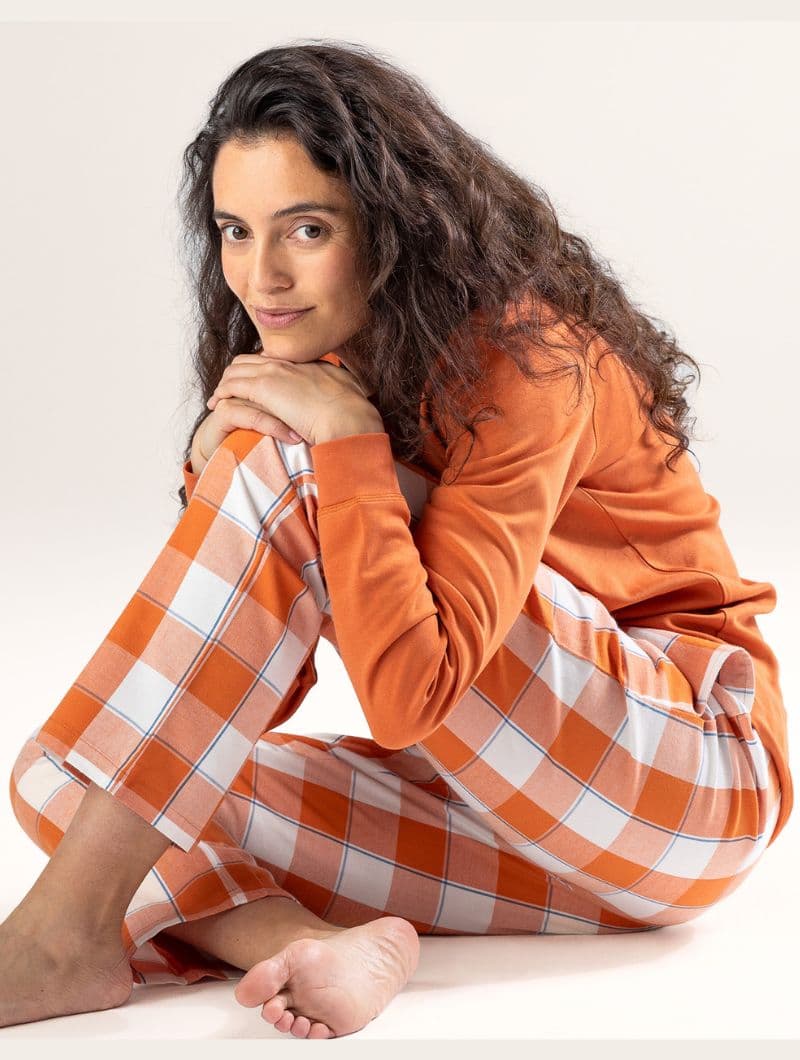 El pijama cuadros naranja de manga larga ecológico es un conjunto ideal para las noches de invierno.