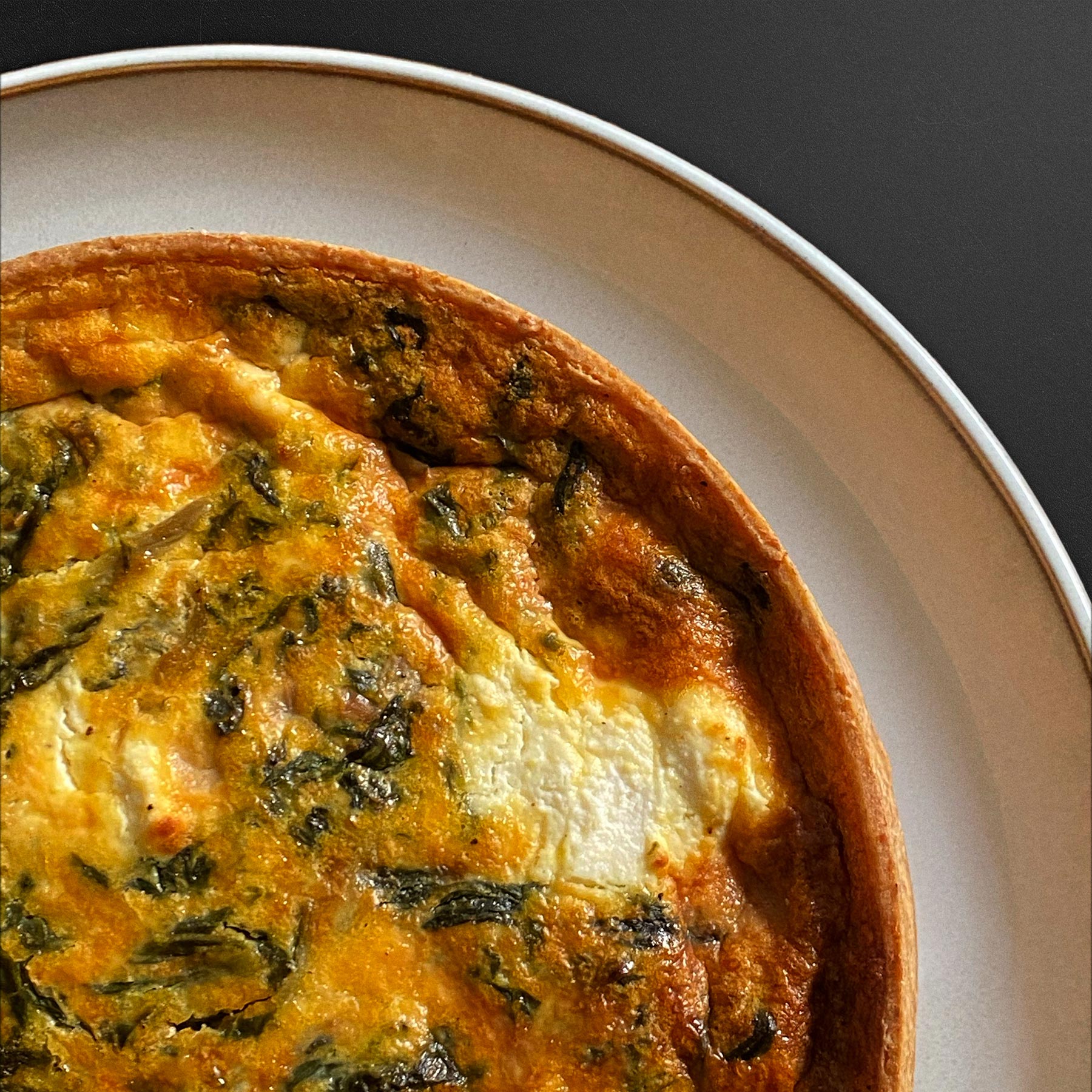 Quiche rellena de espinacas, requesón y pasas sobre masa quebrada integral.