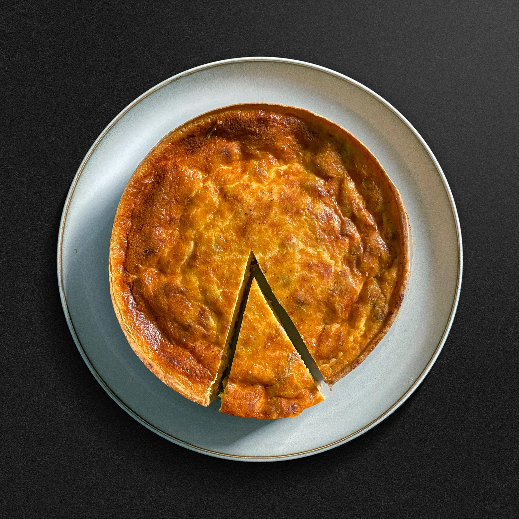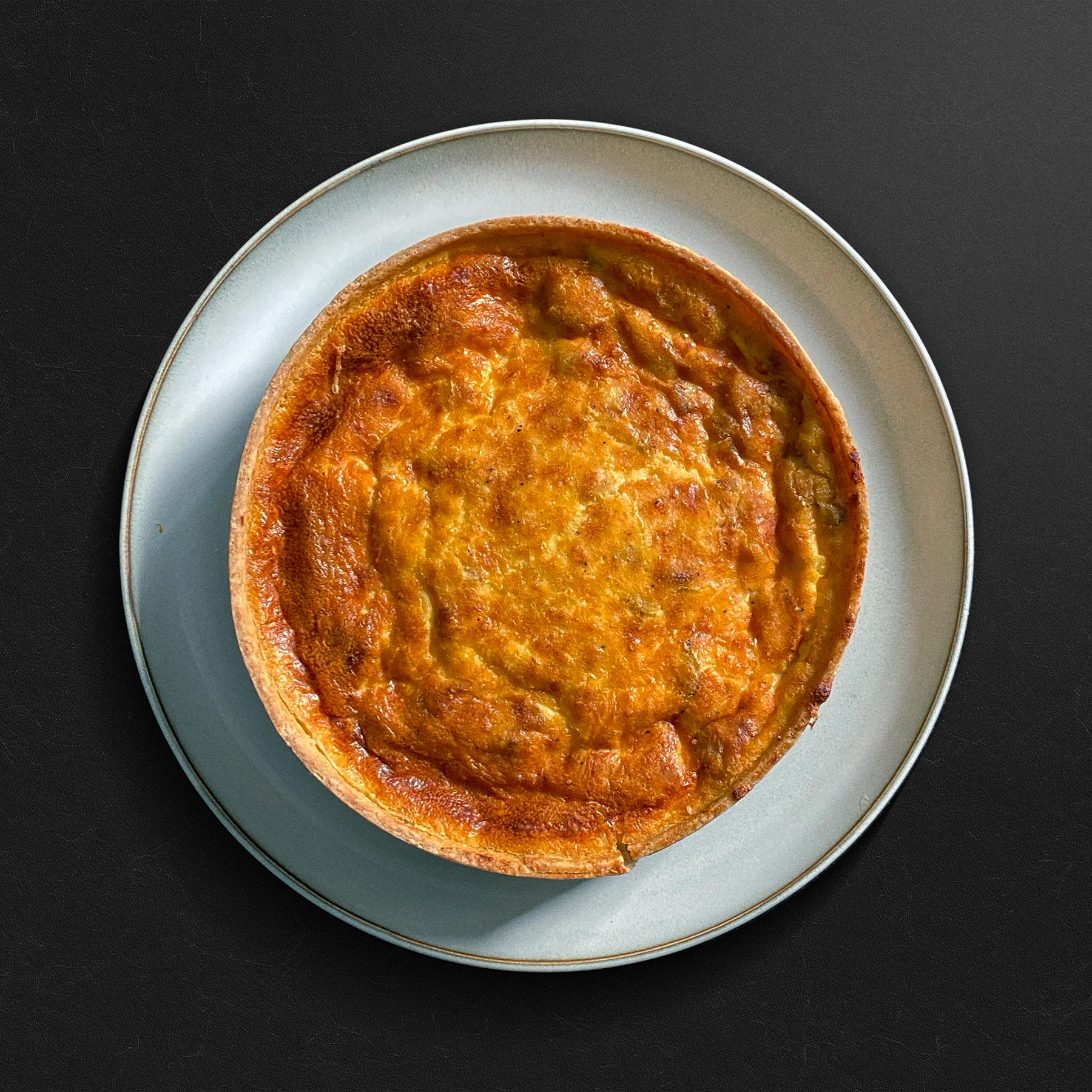 Quiche Lorraine rellena con trocitos de bacon y cebolleta pochada sobre masa quebrada integral.