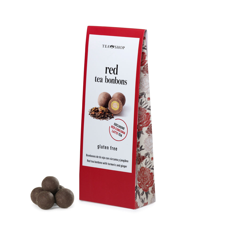 Una explosión de sabores dulces y exquisitos. Bombones elaborados a base de la mezcla exclusiva de Tea Shop: Red Curcuma Latte. El Té Rojo Pu Erh y la cúrcuma lo convierten en un alimento delicioso y selecto. La cúrcuma que da un toque de sabor intenso y exquisito.Conservar en un lugar fresco y seco. No contienen gluten. Contiene azúcares, frutos secos, leche y derivados de la soja. Puede contener trazas de nueces y pistacho.
