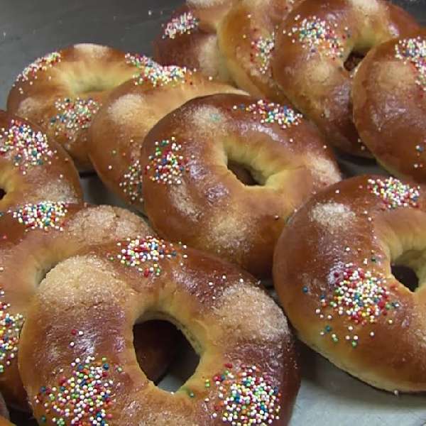 Se divide la masa en porciones pequeñas y se les da forma de rollos o aros, colocándolos en una bandeja de horno forrada con papel pergamino, dejando suficiente espacio entre ellos para que no se peguen durante la cocción.
