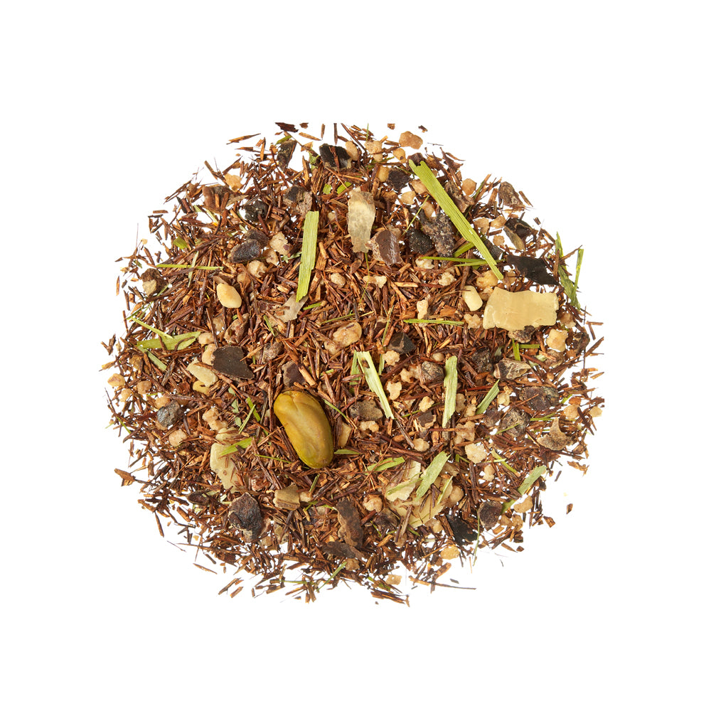 Rooibos aromáticamente dulce que nos traslada a la pastelería de Turquía, donde las tradiciones de oriente y occidente se entremezclan creando sabores astrales. Una Infusión sin teína, donde los frutos secos protagonizan el sabor con notas caramelizadas.El Rooibos de calidad «Super Grade» es sometido a un control de estrictas medidas de higiene. Al ser exclusivo de la zona de Cederberg (Sudáfrica) presenta una limitada producción por temas climáticos, hecho que eleva su valor en los mercados internacionales.