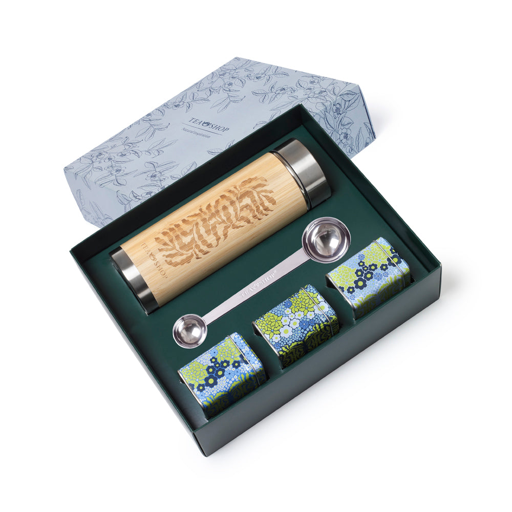 Perfecto para quienes disfrutan de un té estén donde estén. Este set contiene todo lo necesario para poder hacer un té en cualquier momento. Incluye un Travel Tea de acero inoxidable, cierre hermético, infusor en el interior y con acabado en elegante bambú. El set también incluye tres minitins rellenos de: 25g Té Rojo Pu Erh Vanilla Bellini, 25g Té Verde Fresh Colada, 25g Té Negro Vital Mango. Perfectos para llevártelos donde quieras y mantenerlo en buen estado. Por último, una medida dúo que ayudará a saber exactamente los gramos necesarios para que el té quede perfecto.