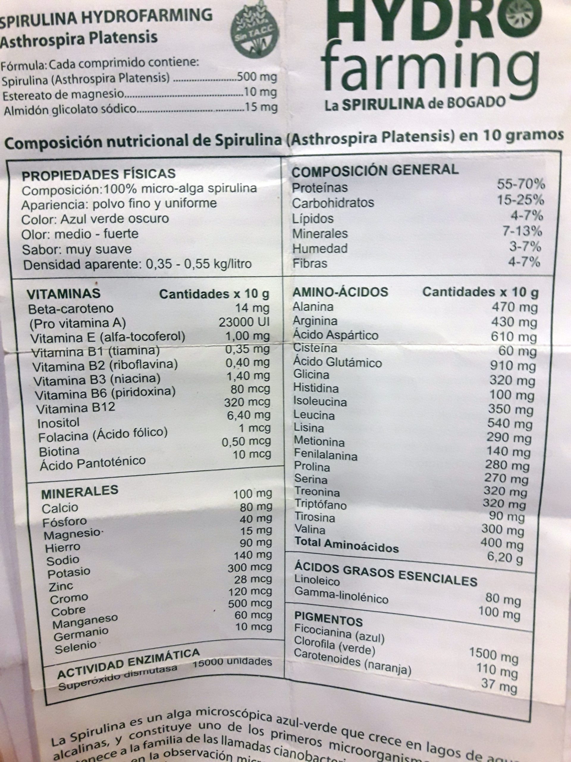 En su composición, se destaca el alto contenido proteico, contiene todos los aminoácidos esenciales (aquellos que el organismo no puede fabricar por sí solo y necesita que sean incorporados de manera exógena); y esta cualidad hace de spirulina un suplemento de alta calidad nutricional, además de que aporta vitaminas, minerales, antioxidantes y elementos esenciales, tiene grandes propiedades para la salud: entre las más destacadas se encuentra la capacidad de fortalecer el sistema inmunológico; el aumento de la energía y el rendimiento físico, propiedad que le otorgan los pigmentos que retienen la energía natural del alga, otorgando bienestar; el retardo en el envejecimiento (por su efecto antioxidante); el control sobre la anemia, debido a que su hierro es de muy fácil absorción y al aporte de vitamina B 12 en cantidades suficientes y de pequeñas cantidades de ácido fólico.
