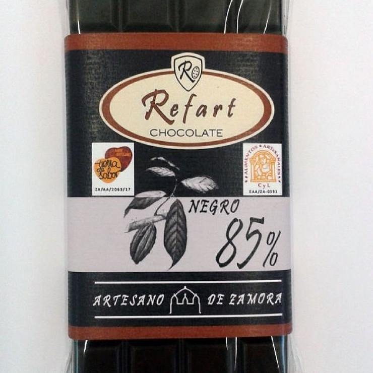Tableta de chocolate negro 85%. Chocolate de aroma floral, amargor intenso y notas de madera.
