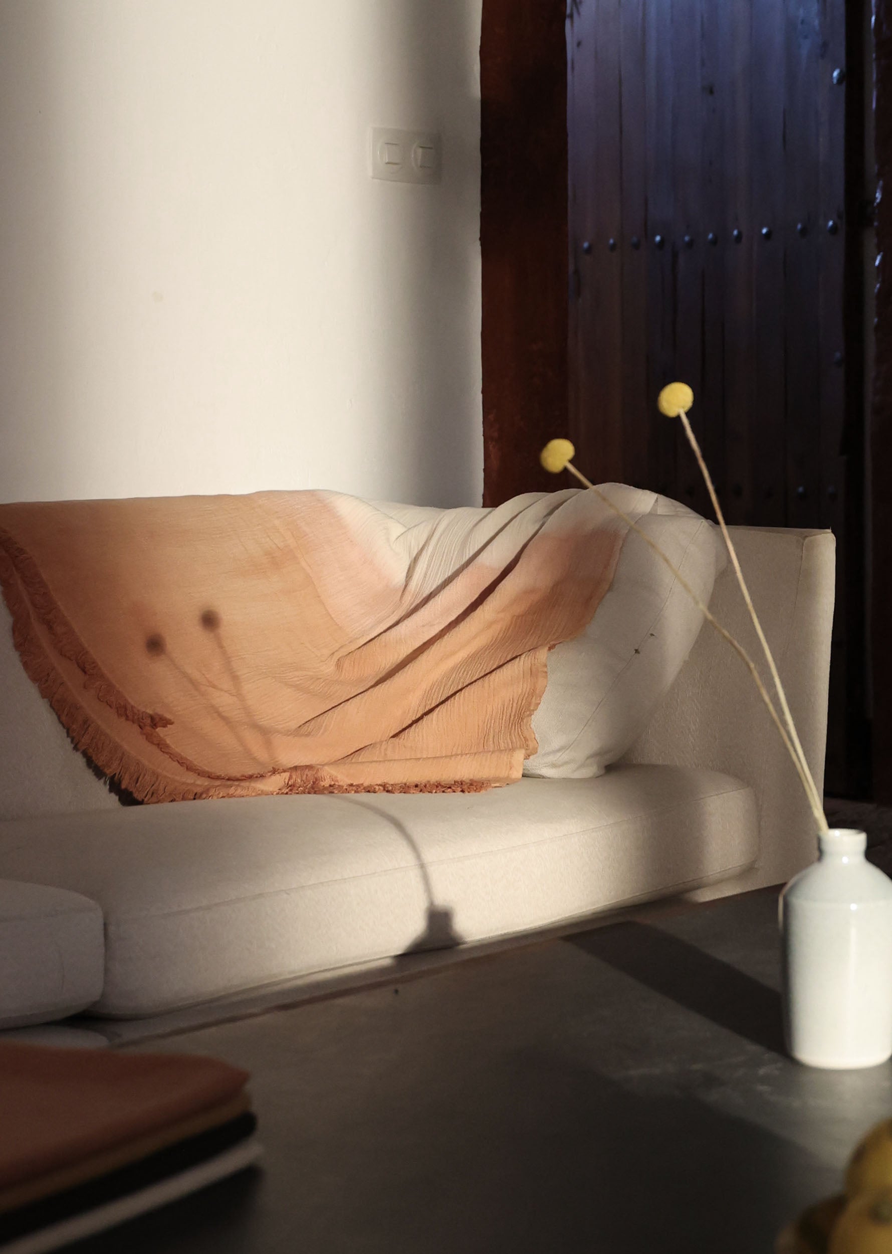 para saber más acerca de cómo cuidar esta pieza y sobre las posibles variaciones de color en las prendas teñidas con tintes naturales.