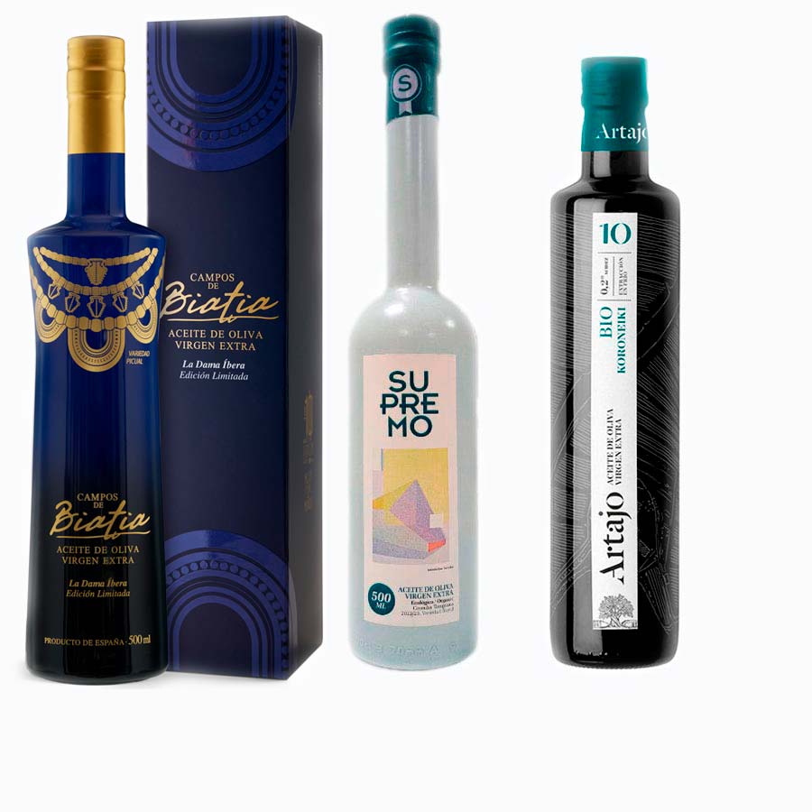 Pack compuesto por los mejores aceites de oliva virgen extra del mundo de variedad picual, royal y koroneiki. Según la Guía Evooleum, estos tres aceites –Campos de Biatia Picual Dama Íbera, Supremo y Artajo Koroneiki son los mejores del mundo en su variedad de aceituna.