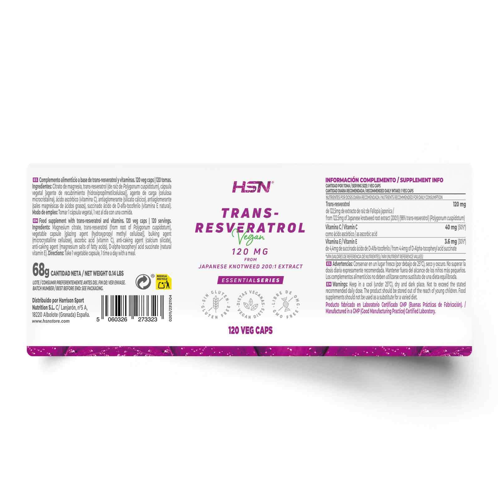 Resveratrol 120mg de EssentialSeries es un complemento alimenticio en cápsulas vegetales, a base de extracto seco de la planta Polygonum cuspidatum, ácido ascórbico, succinado ácido de D-Alfa-tocoferilo.