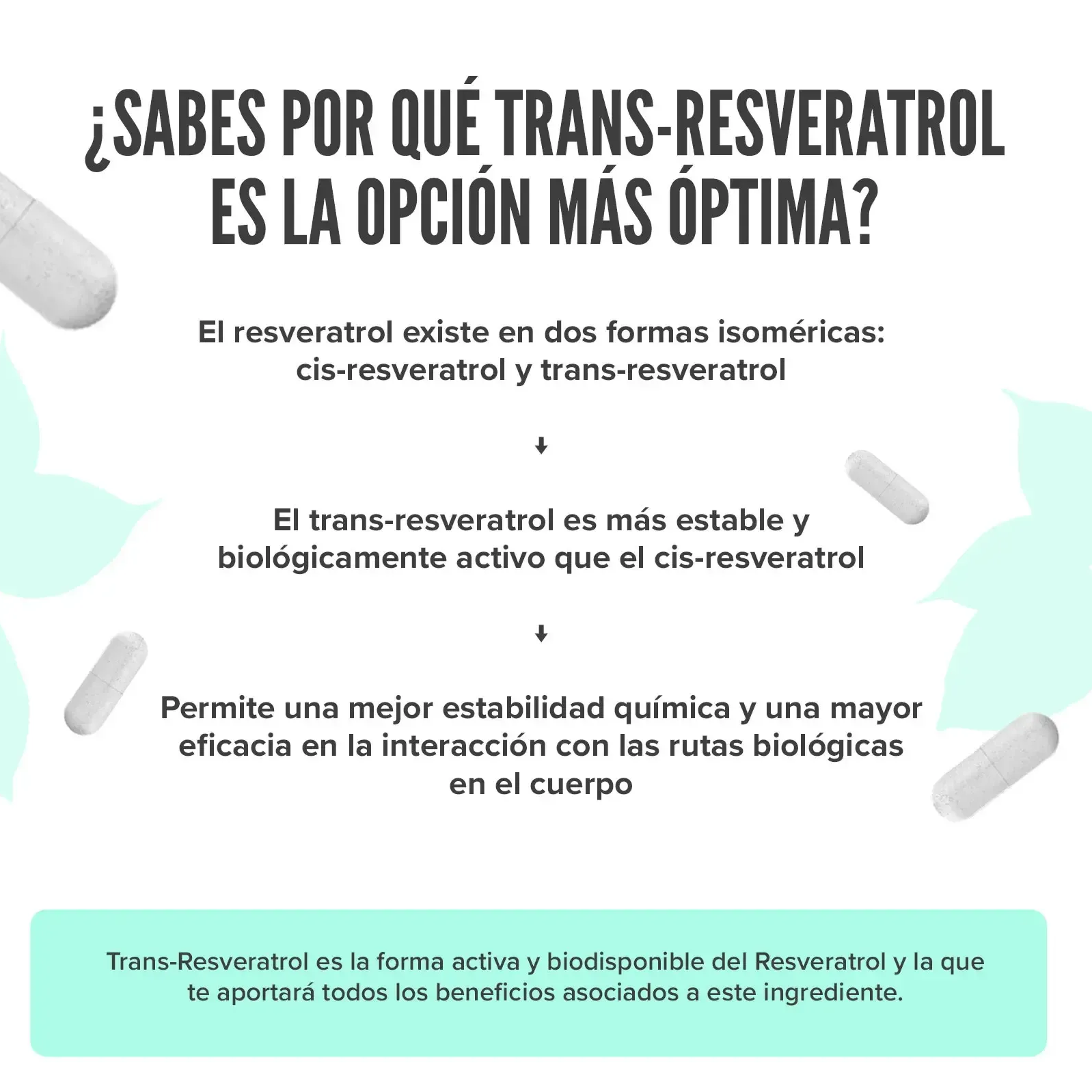 Este producto ha sido titulado al 98% de resveratrol, asegurándote así el contenido de polifenoles que te encontrarás en cada cápsula; para que sepas exactamente qué cantidad estás consumiendo y se reconozca la calidad del producto.