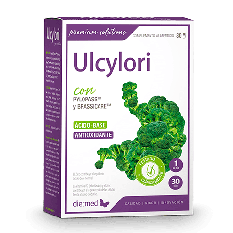 ULCYLORI® de Dietmed, es un complemento con una elevada concentración (40:1) de brócoli en extracto lo que le hace idóneo para las dolencias digestivas. Se ha mostrado muy efectivo en la reducción de la bacteria Helicobacter pylori. Muy útil también para desintoxicación del organismo y para la protección de las paredes estomacales e intestinales.