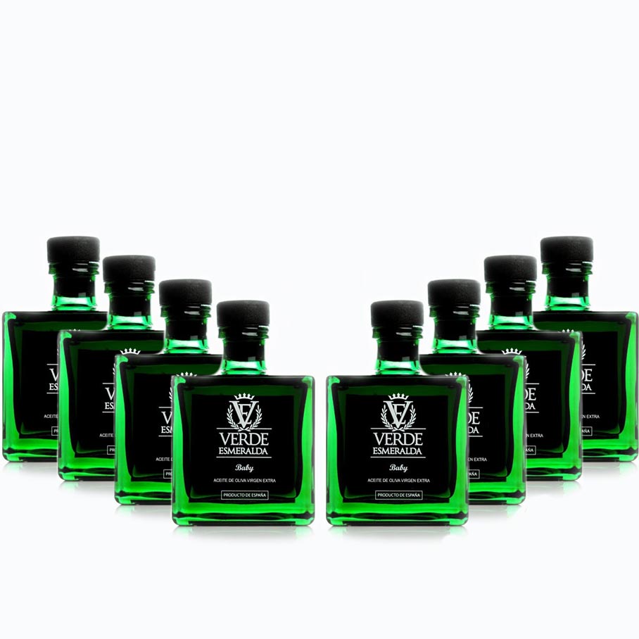 Pack compuesto por 8 botellas de Verde Esmeralda Baby Picual, de 100ml cada una. El aceite de esta botella de tamaño mini tiene la misma calidad que Verde Esmeralda Premium 500 ml, pero se conserva en una botella verde más pequeña, ideal para regalar o para aquellos que prefieren menor cantidad de aceite.