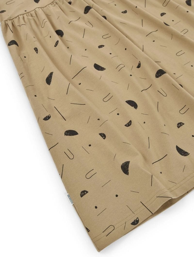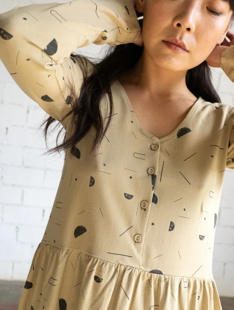Te presentamos nuestro vestido manga ranglán beige con estampado sideral. Esta prenda, ideal desde el otoño hasta la primavera, está confeccionada con un 95% de algodón orgánico y un 5% de elastano, asegurando su alta frescura y suavidad.