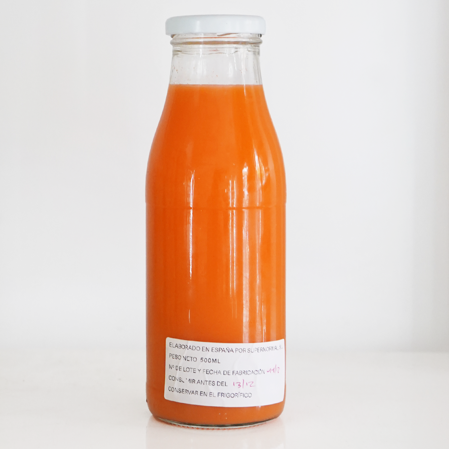 Zumo ecológico de naranja y zanahoria. Elaborado en nuestro obrador con ingredientes ecológicos de nuestra huerta.