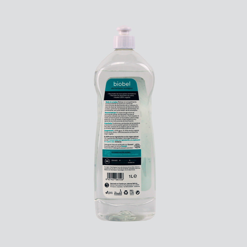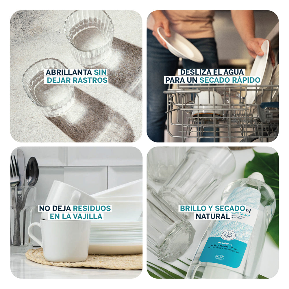Abrillantador para lavavajillas automático formulado con el 100% de ingredientes de origen natural. Vegano. A base de alcohol vegetal desnaturalizado de forma natural y aceite esencial de limón, deja la vajilla seca y brillante. Desinfecta de manera totalmente natural y abrillanta sin ingredientes que liberan cloro.