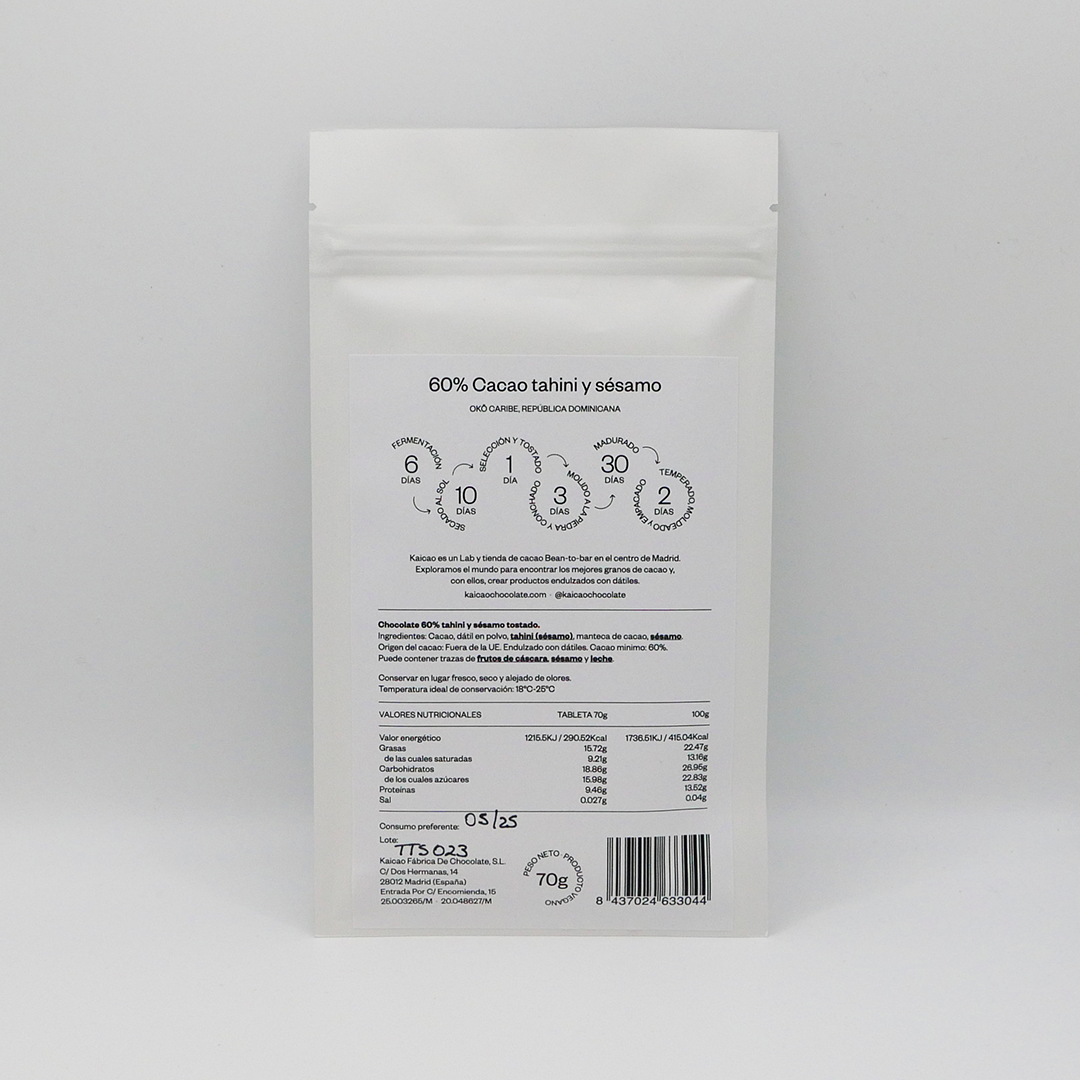 Tableta de chocolate negro elaborada por KAICAO en Madrid. Su textura cremosa se consigue gracias a la mezcla del tahini con los granos de Okö Caribe, República Dominicana que aportan notas de sabor a nuez y fruta. En la parte posterior de la tableta añade sésamo para aportar ese toque crujiente.