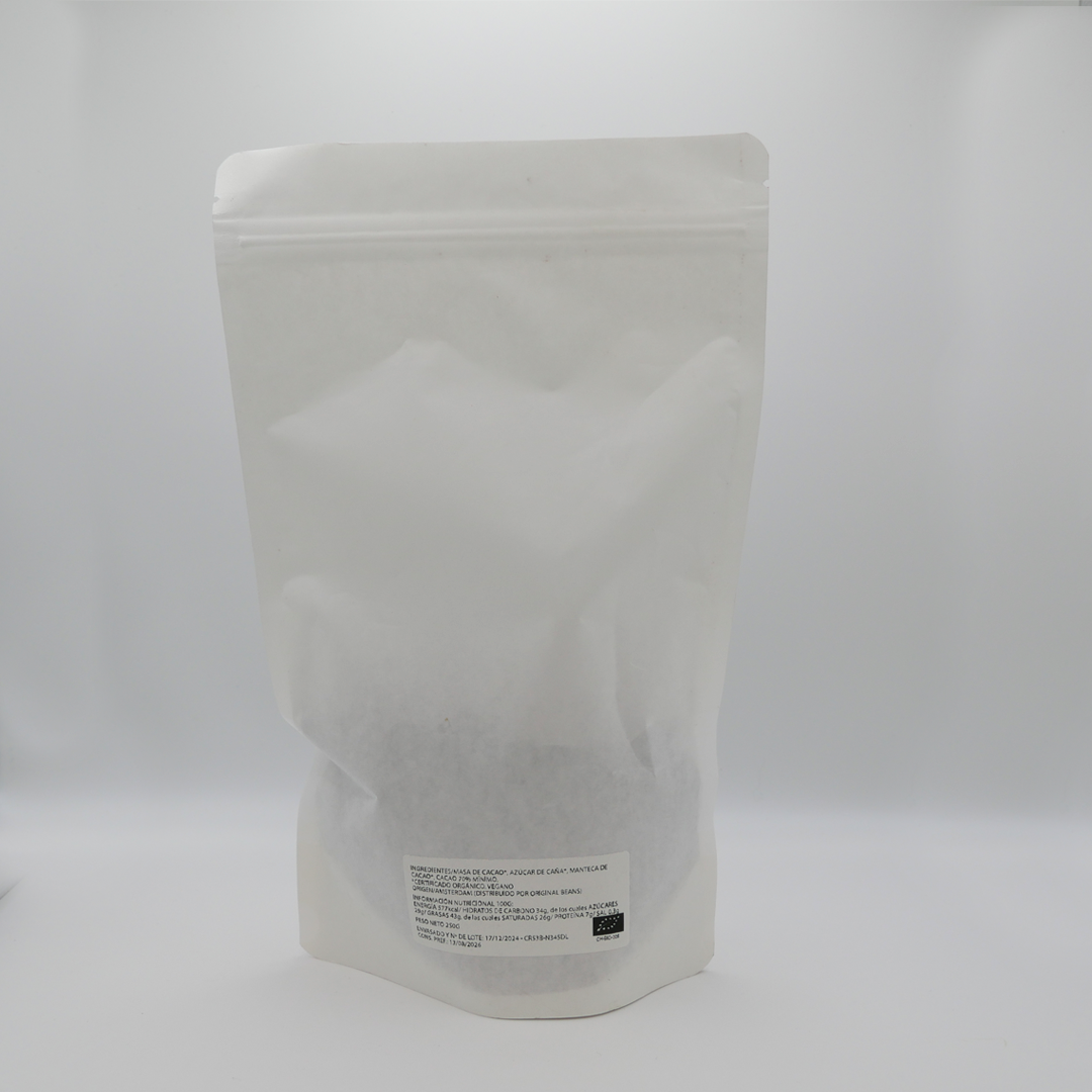 Gotas de chocolate grandes para hacer cobertura de chocolate en elaboraciones dulces. Distribuida por original beans su sabor y textura al fundir son increíbles.